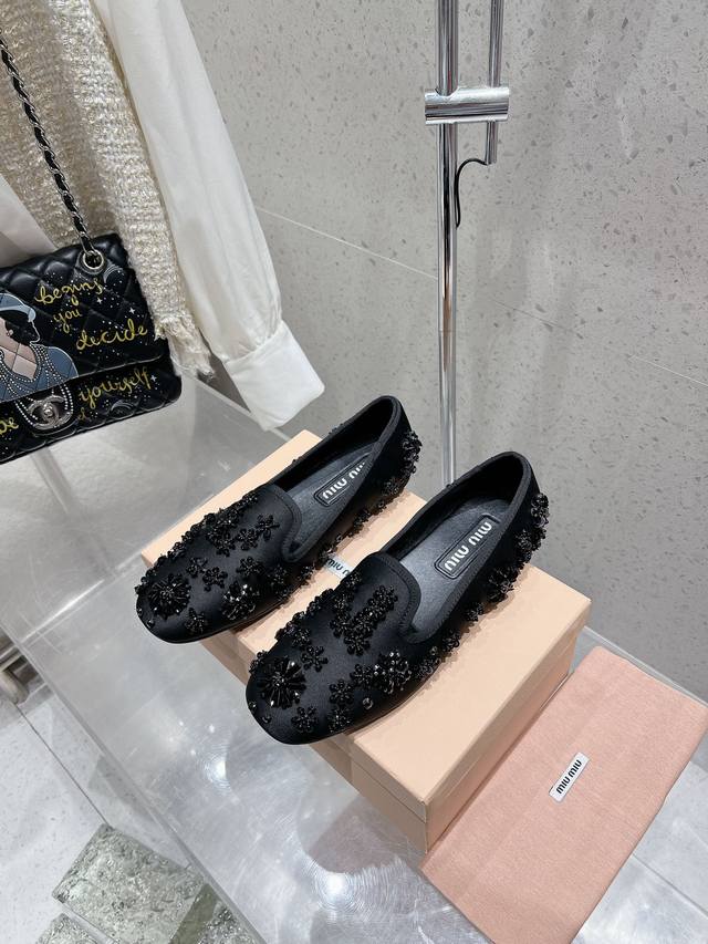 430 高版本 原版开发Miumiu 缪缪 新款圆头平底乐福鞋 面料:进口真丝 重手工钉绣钻珠片花朵 内里:内里垫脚羊皮 鞋底:原版橡胶大底 码数:35-39