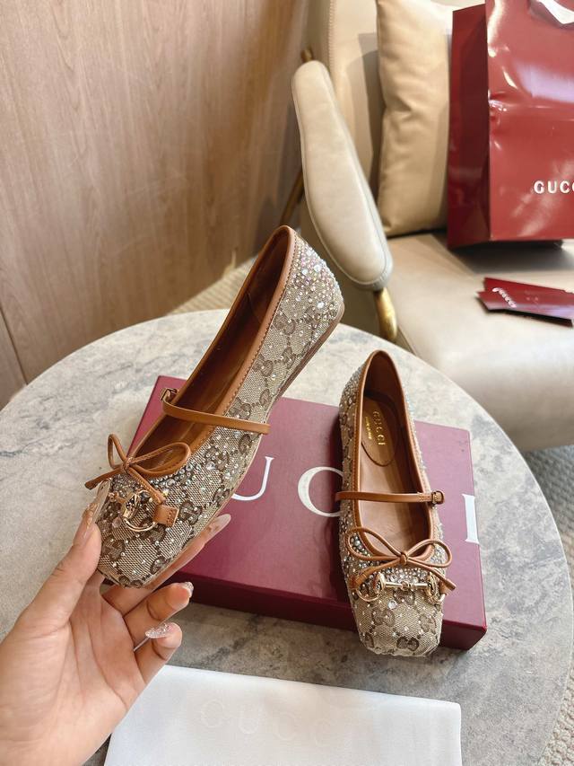 9099- 1 杏G钻 DDD 这款标志性的马衔芭蕾平底鞋向由方形褶头帽和精致蝴蝶结细节定义的原始芭蕾舞鞋轮廓致敬。这种风格是在Gg帆布和一个浅金色调的马衔扣饰以彩色水钻 Sacchetto 结构确保了高水平的舒适性,也得益于柔软的衬垫鞋垫。 DDD 尺码:女35-42 女41.42 定做 DDD 包装:全套包装 DDD