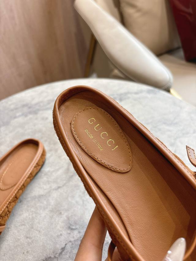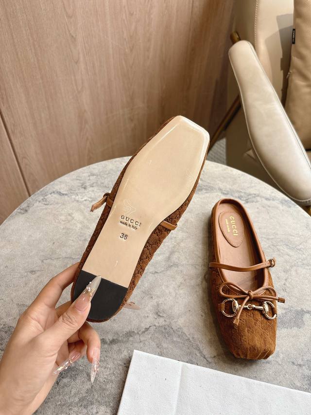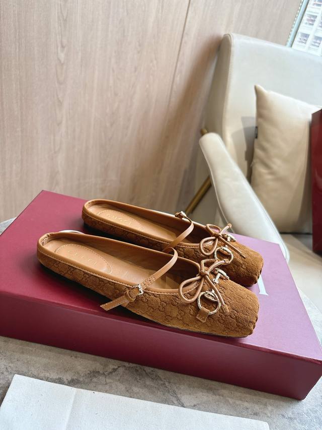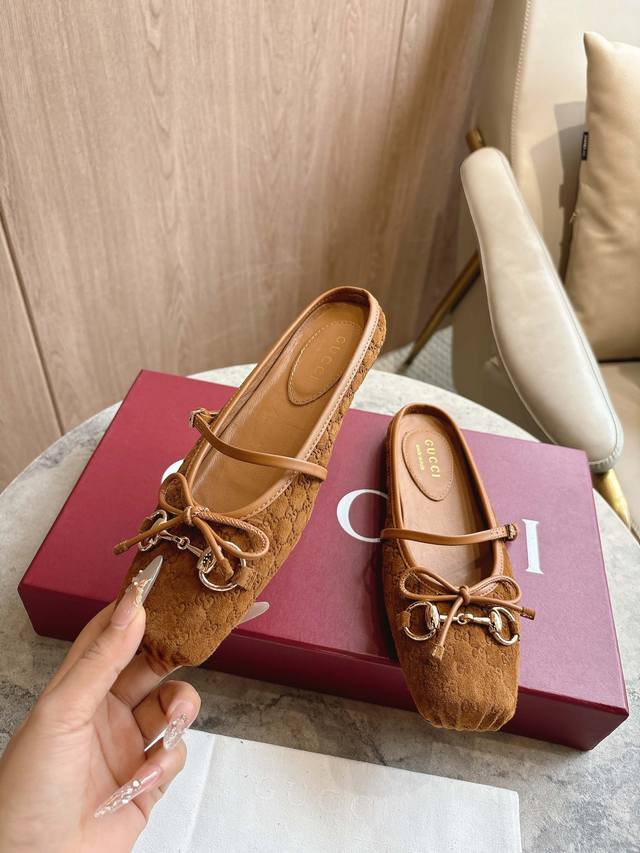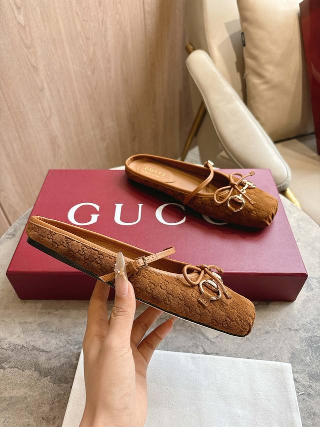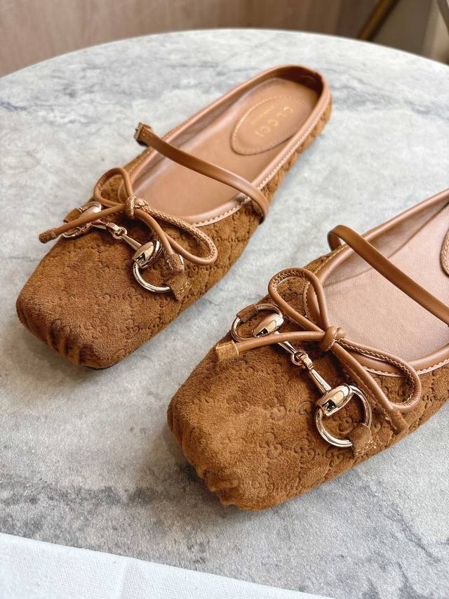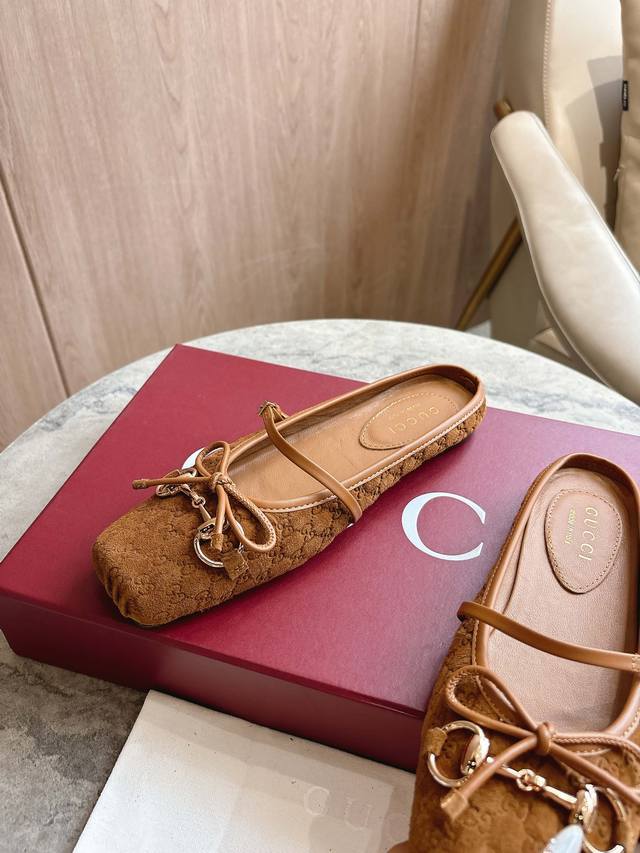 9099-10C 棕G¥ 35-42 2025秋冬系列, 这款马衔扣平底芭蕾穆勒鞋选用方形收口鞋头设计,搭配雅致的蝴蝶结细节,致敬传统芭蕾舞鞋款型。这款单品以皮革匠心打造,缀饰浅金色调配件。“Sacchetto”构造确保出色的舒适感。 DDD 棕色双G皮革 DDD 浅金色调配件 DDD 皮革衬里 DDD 马衔扣 DDD 皮革蝴蝶结细节 DDD 皮革鞋底 DDD “Sacchetto”构造 DDD 柔软加衬内底 DDD 绑带固定设计,配可调节搭扣 DDD 平底 DDD