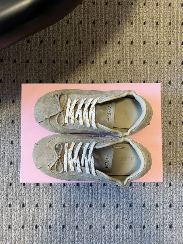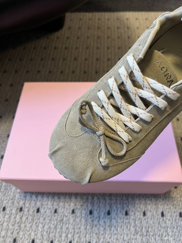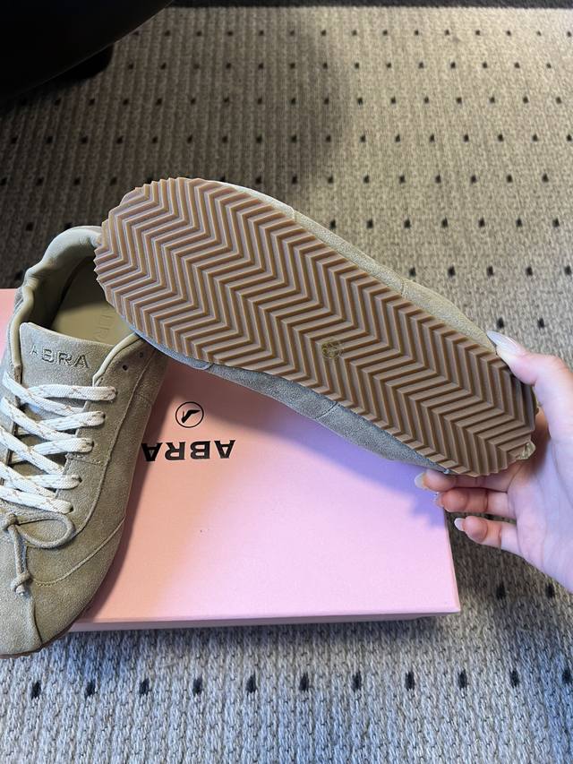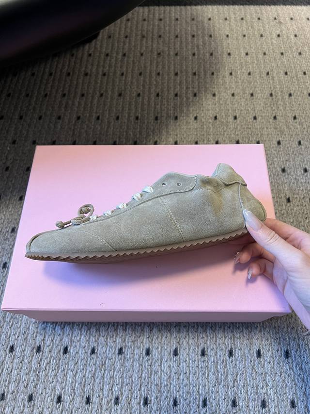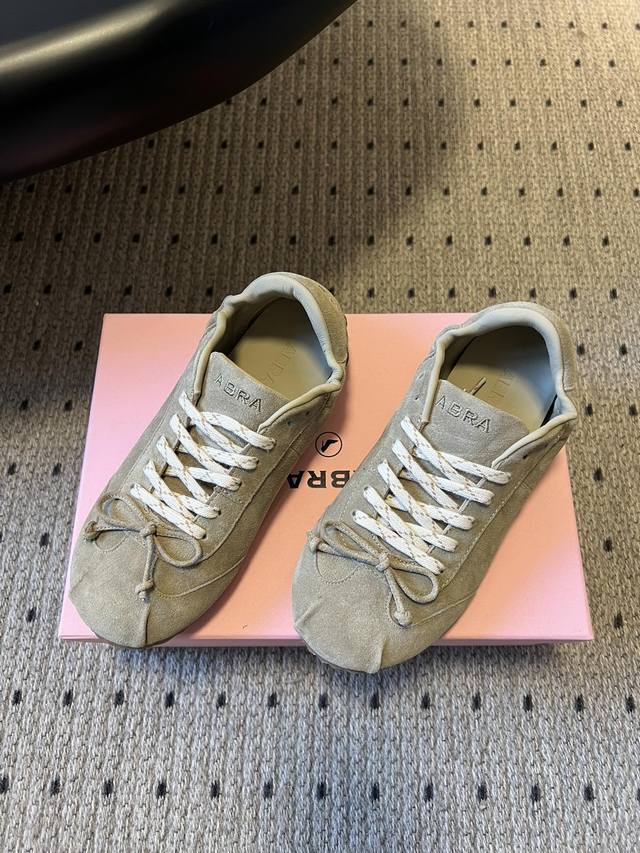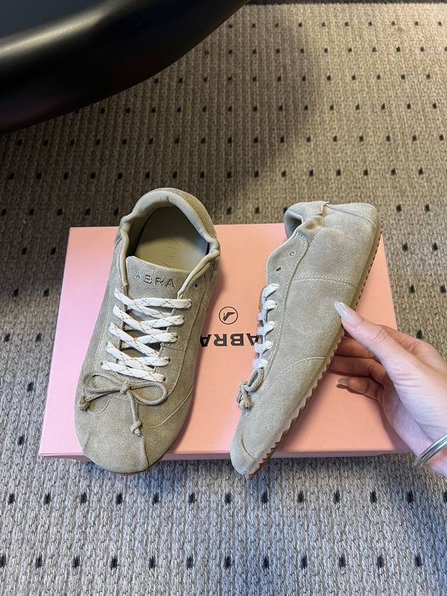 Abr* 25Ss复古圆头蝴蝶结平底芭蕾风德训鞋 DDD 把芭蕾鞋的优雅和德训鞋的复古休闲结合,既有少女感又不失街头松弛感。采用麂皮、缎面、皮革等多种材质,鞋面拼接有纹理层次感,带“Abra”品牌标识。 DDD 圆头+薄软鞋底,鞋头空间宽松不挤脚,后跟做了弹性松紧圈,贴合脚型且不磨脚,上脚显脚小。鞋底是轻量橡胶材质,柔软到能90°折叠,走路像“踩棉花”,同时带防滑纹路;透气性好,光脚穿也不闷脚。 DDD 鞋面:牛反绒 牛皮 DDD 内里:羊毛 DDD 大底:橡胶大底 DDD 增高:2.5Cm DDD Si