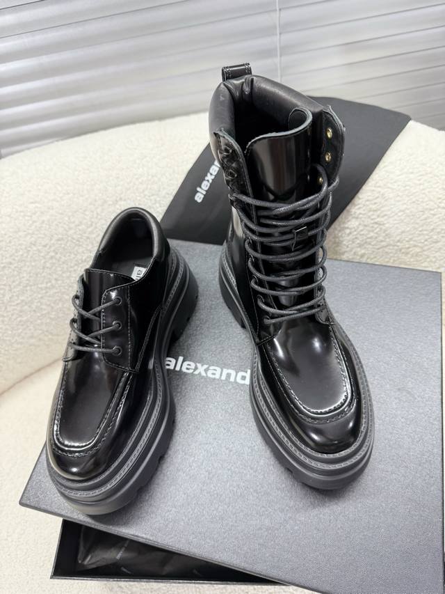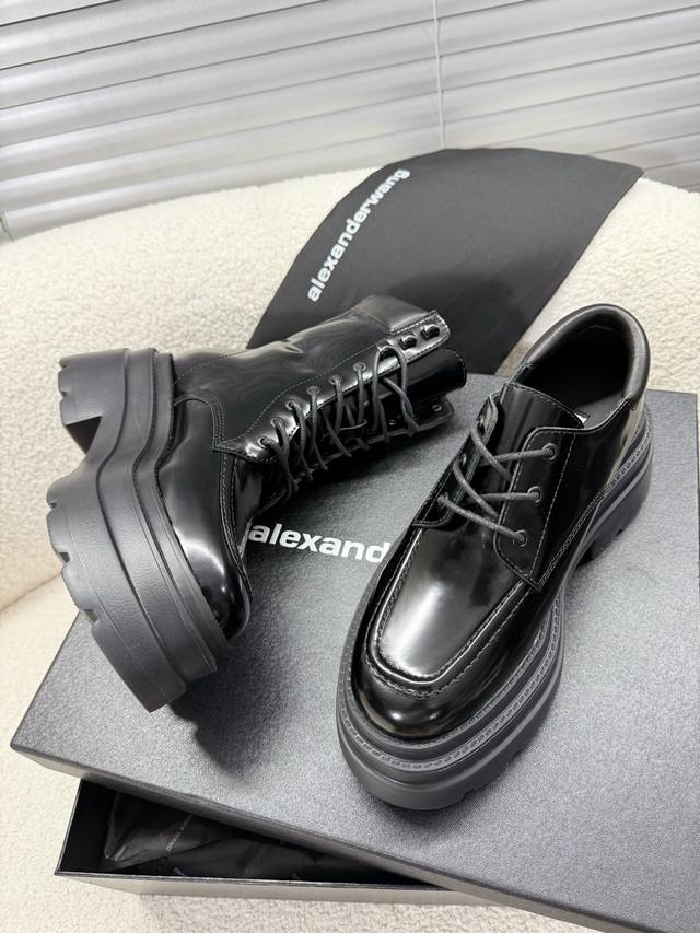 Alexander Wang 厚底鞋,乐福鞋,马丁靴,短靴~~ 大王这双厚底乐福鞋绝对是腿精必备神器 显高显瘦,黑色经典百搭王~~ 高光皮面搭配激光Logo,绑