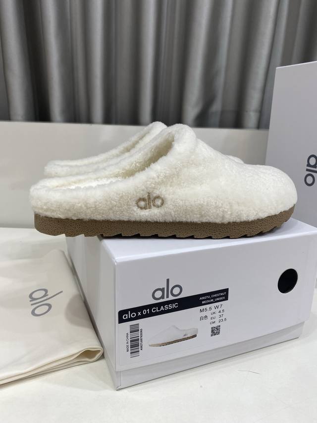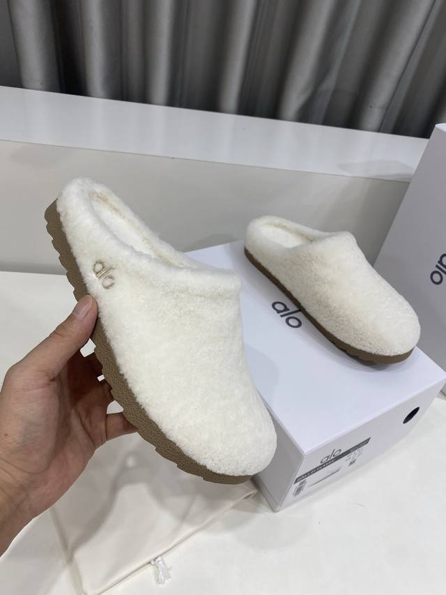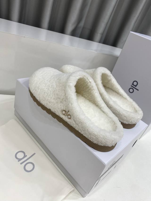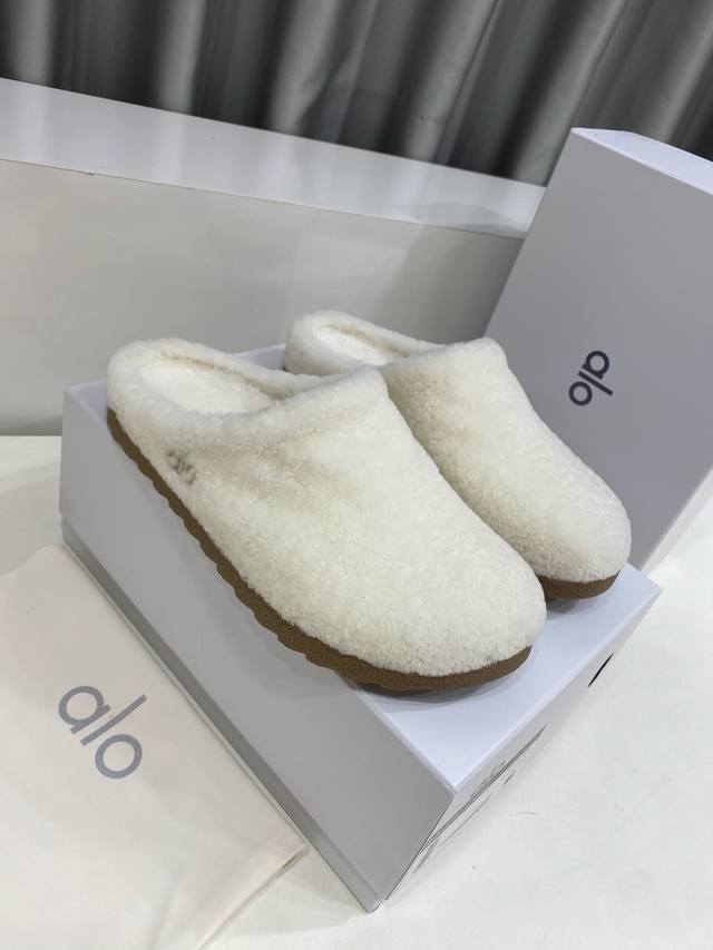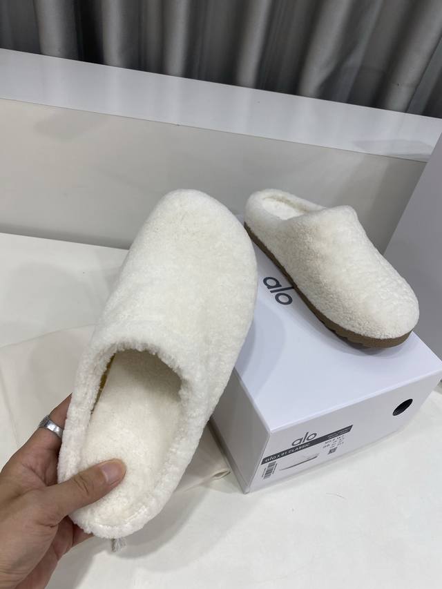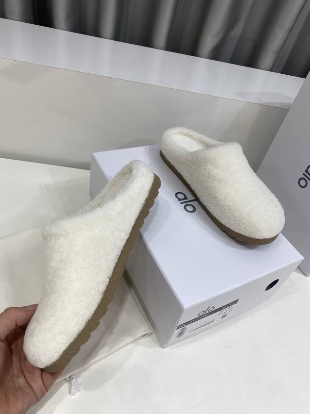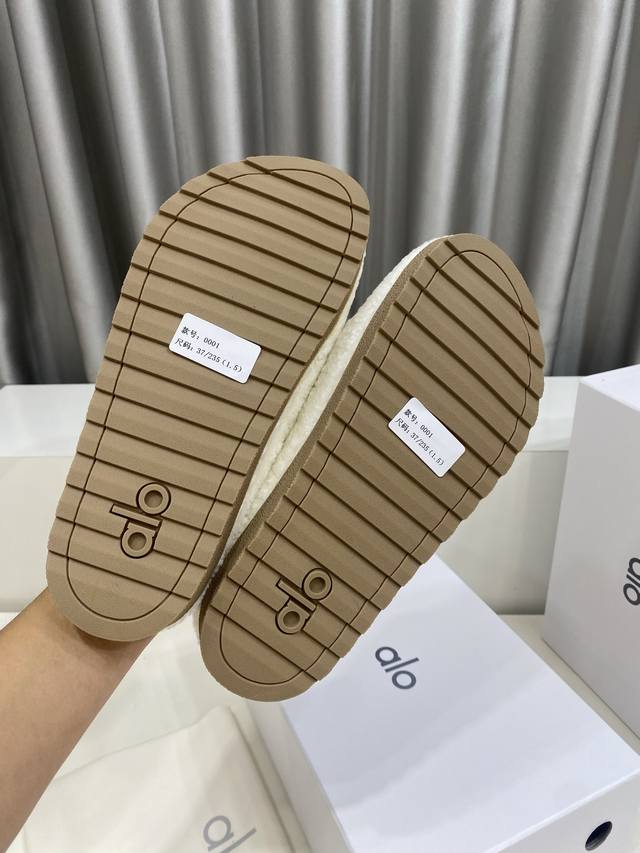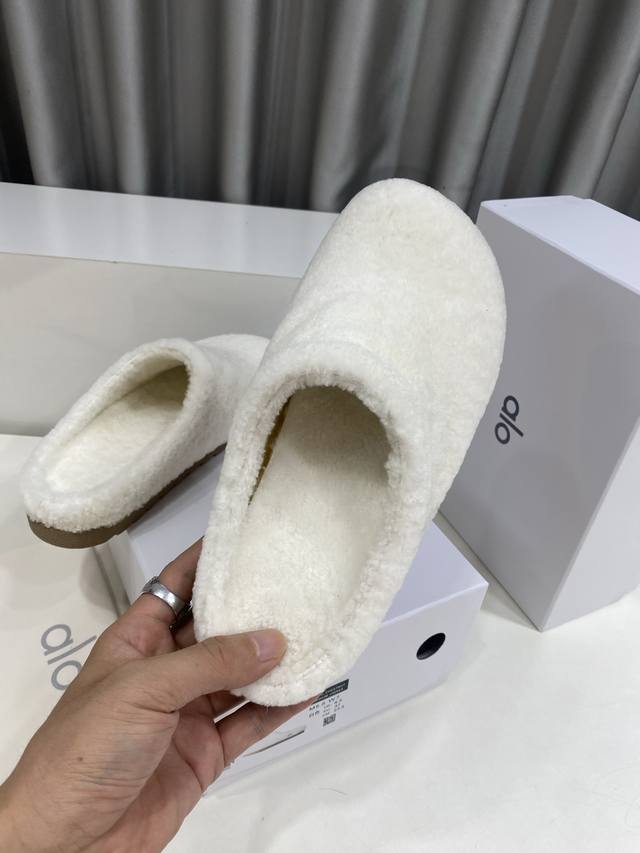 Alo小众潮牌秋冬新款 懒人毛拖鞋 居家户外两不误 质感细腻柔和。鞋口处环绕着蓬松的白色毛绒,不仅为双脚带来温暖包裹,还增添了可爱氛围。简约的款式设计,方便穿脱,无论是居家放松,还是在温暖的天气里短时间外出,都十分合适,能为日常穿搭带来舒适与随性的感觉。 大底:原开模钢印组合橡胶大底 码数:女35~39 40、定做不退换 全套专柜原包装
