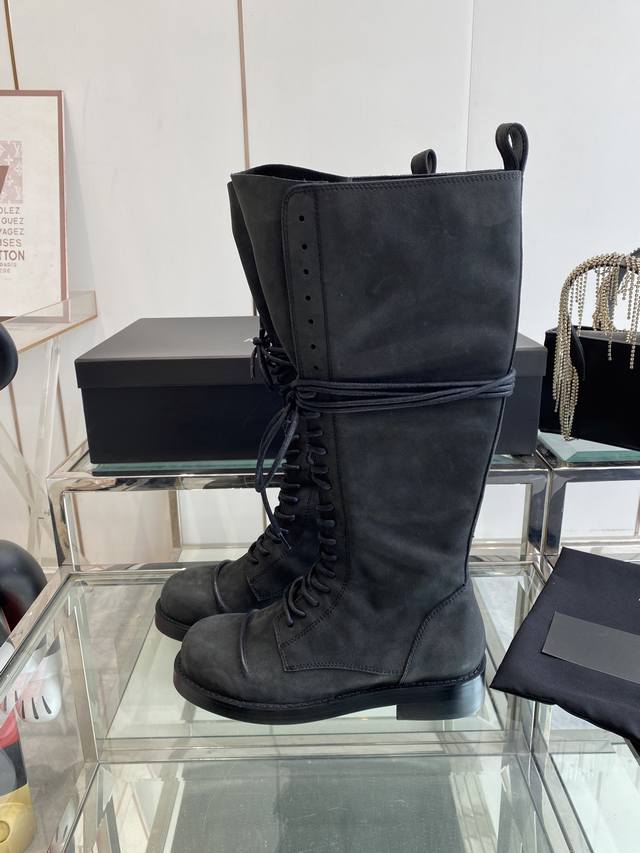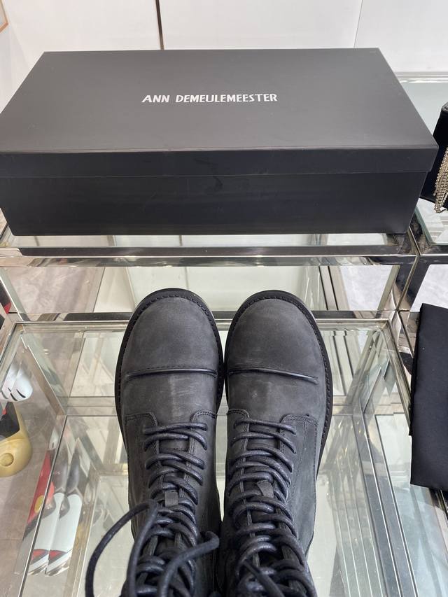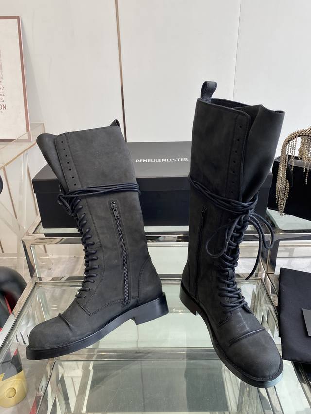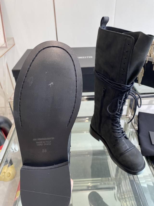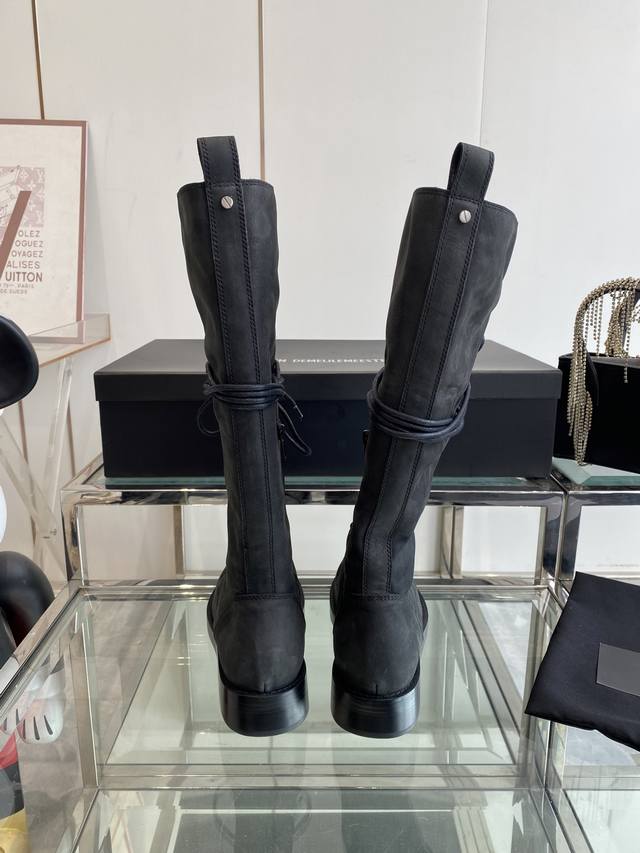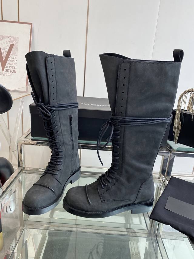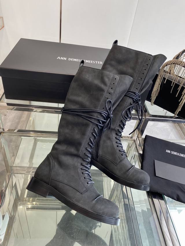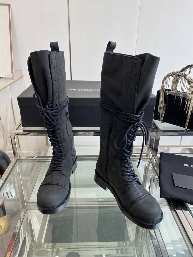 Ann Demeulemeeste 25Ss新款绑带长靴 该系列将未加工的粗粝质感与细腻的脆弱美学创造性结合,在解构主义剪裁中塑造出兼具力量与柔情的现代女性形象,彰显了品牌在当代时装语境中的先锋地味黑色高筒靴,优雅复古的完美结合。圆头厚底,复古韵味十足;绑带侧拉链,细节中透露出精致。大小码齐全,适合各种穿搭风格。无论是搭配连衣裙还是长裙都能轻松打造出优雅复古风。这双黑色高筒靴,让你在复古的浪潮中,展现出独特的优雅气质。 鞋面:头层油蜡牛磨砂 内里:软丝绸牛里 大底:橡胶组合底 码数:35-40 40订做