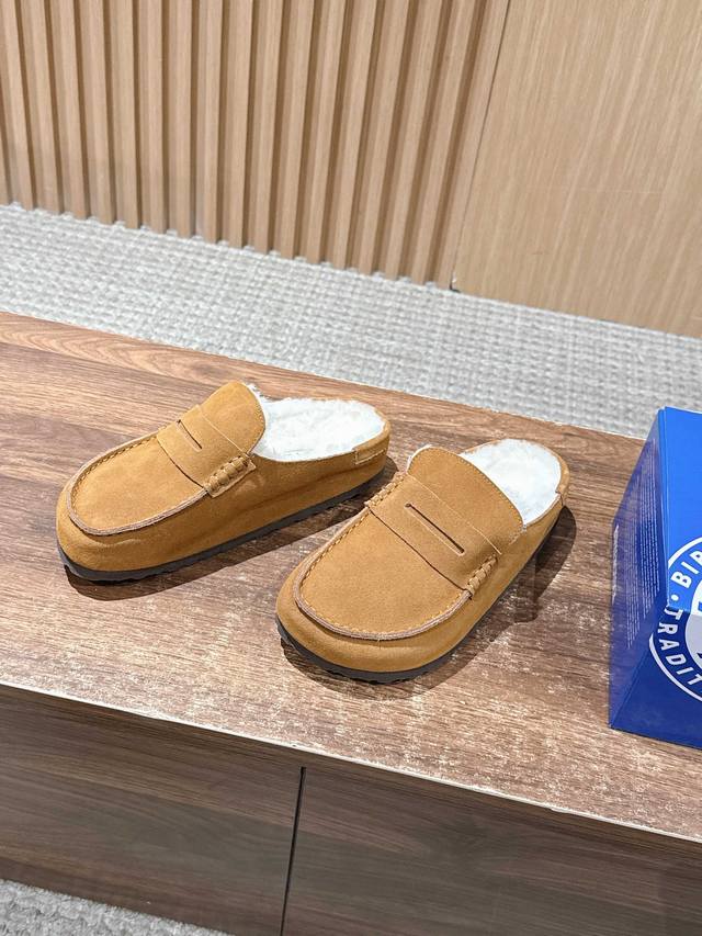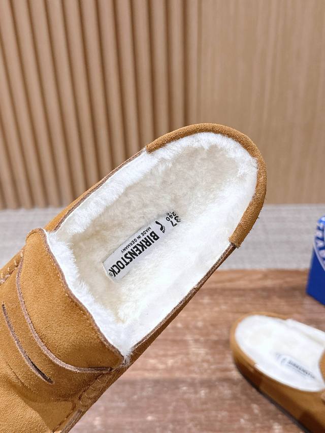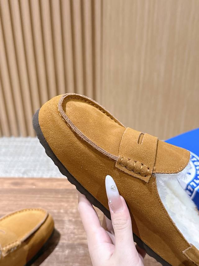 Birkenstock 勃肯包头毛毛拖鞋加绒软木外穿Buckley Shearling系列 DDD 万年经典勃肯强势推出,一个品牌就是一个鞋子类型,其构造鉴于人体工学设计,让脚完全解放舒适打 造的,所以其脚床的构造完全贴合脚的弧度。 DDD 面料采用2.8-3.0厚底的头层牛皮,此牛皮需要从水厂开始做皮,非常的费时费事、Aaa级羊毛里,所以此款鞋子的灵魂,采用纯天然软木一次性压铸射出成型,物性非常的高,不 但透气 DDD 舒适还轻便,再加上弧度贴合脚弓,而且软木乳胶有一定的收缩性,长时间穿着后能贴合脚型,