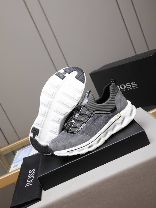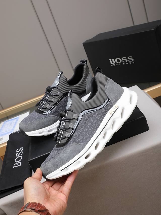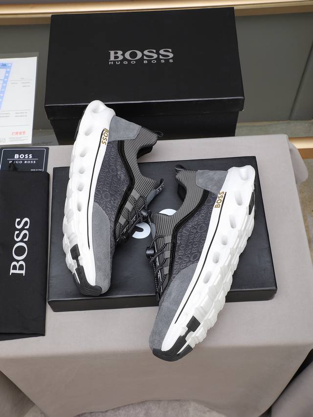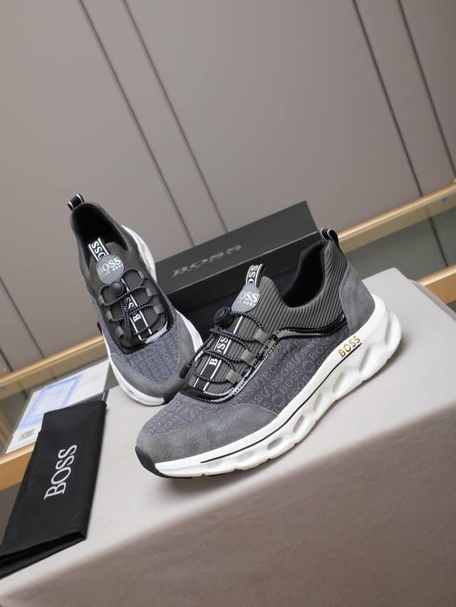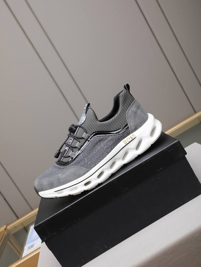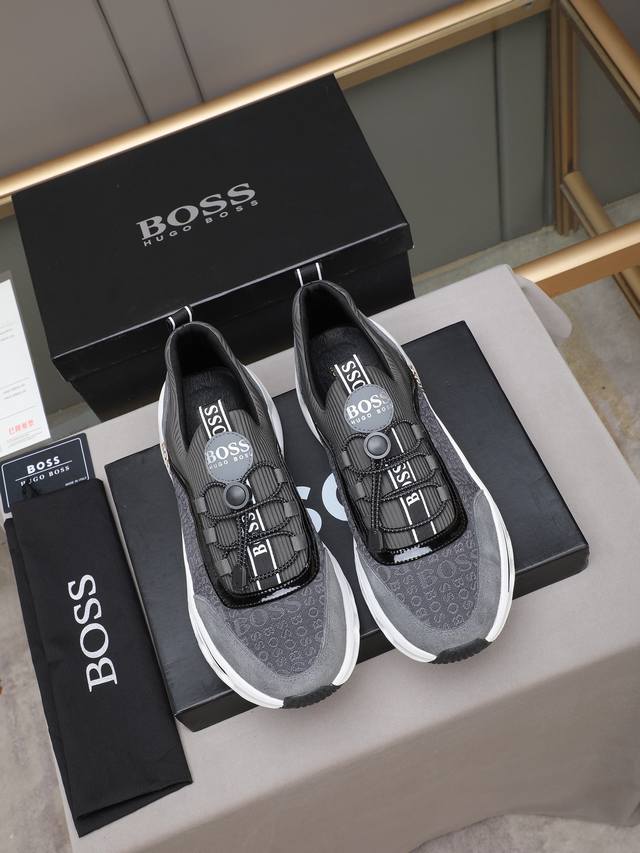 / Boss新品奢潮运动鞋,动感外观,简约造型、进口牛皮打造,透气舒适,鞋舌品牌Logo装饰,吸汗网面内里,舒适脚感。具有科技冲击感对比鞋底,户外都市运动风潮款!