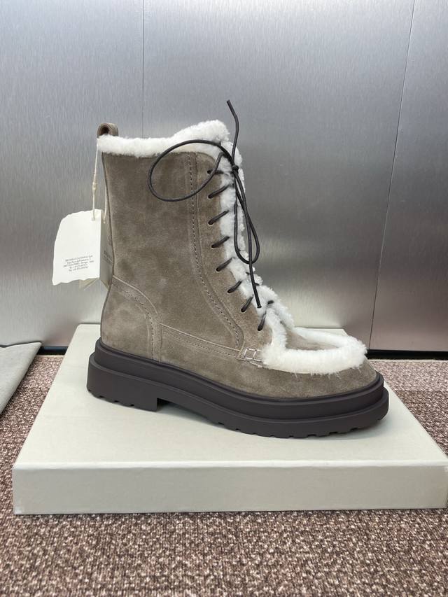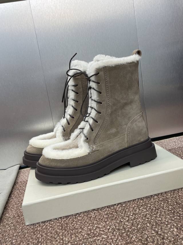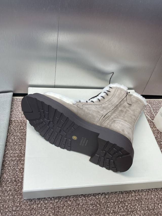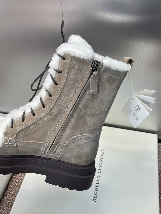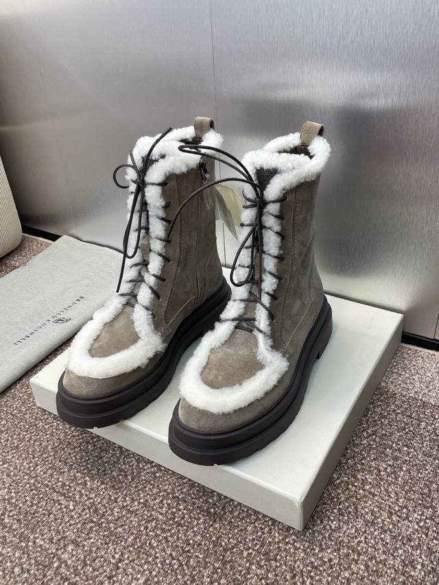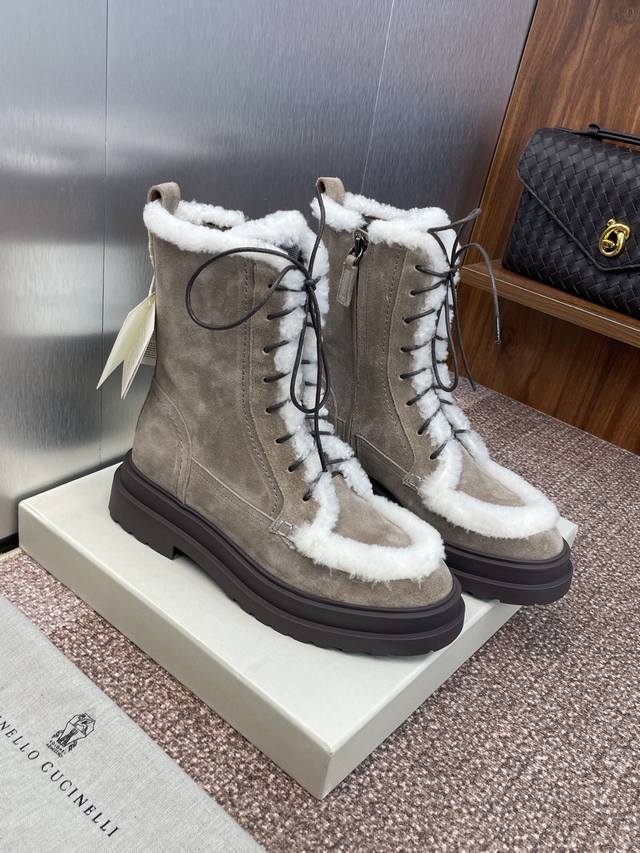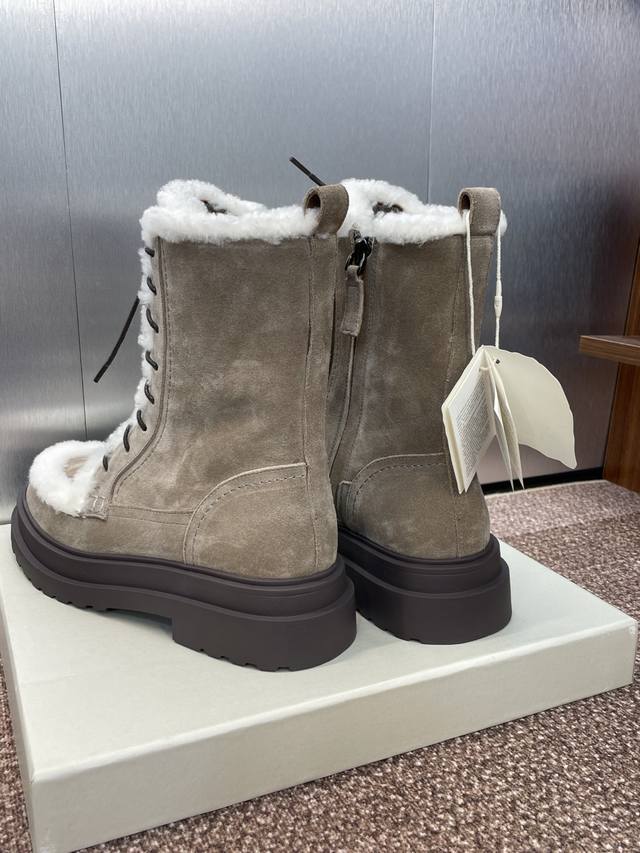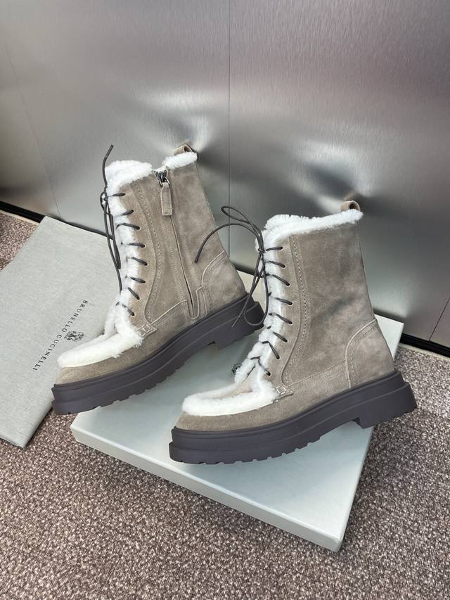 / Brunello Cucineli 布鲁内诺库奇内利2025秋冬新款羊羔毛雪地女短靴 Bc 厚底低跟圆头系带机车骑士军靴 材质:鞋面进口羊猄麂皮+水染羊皮内里+
