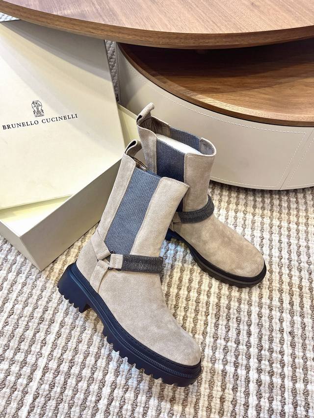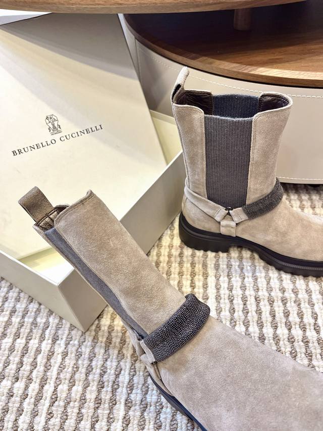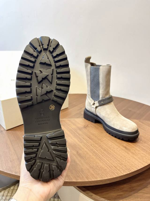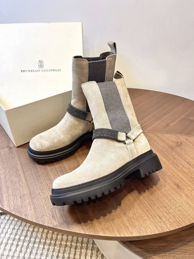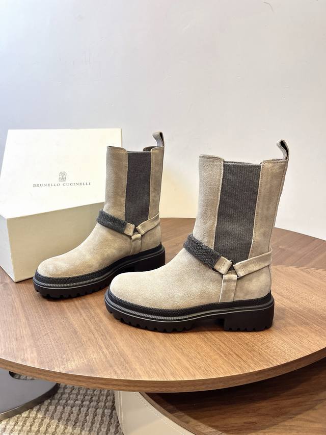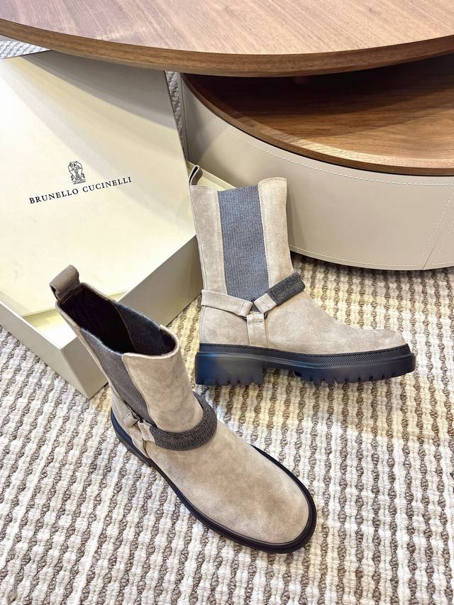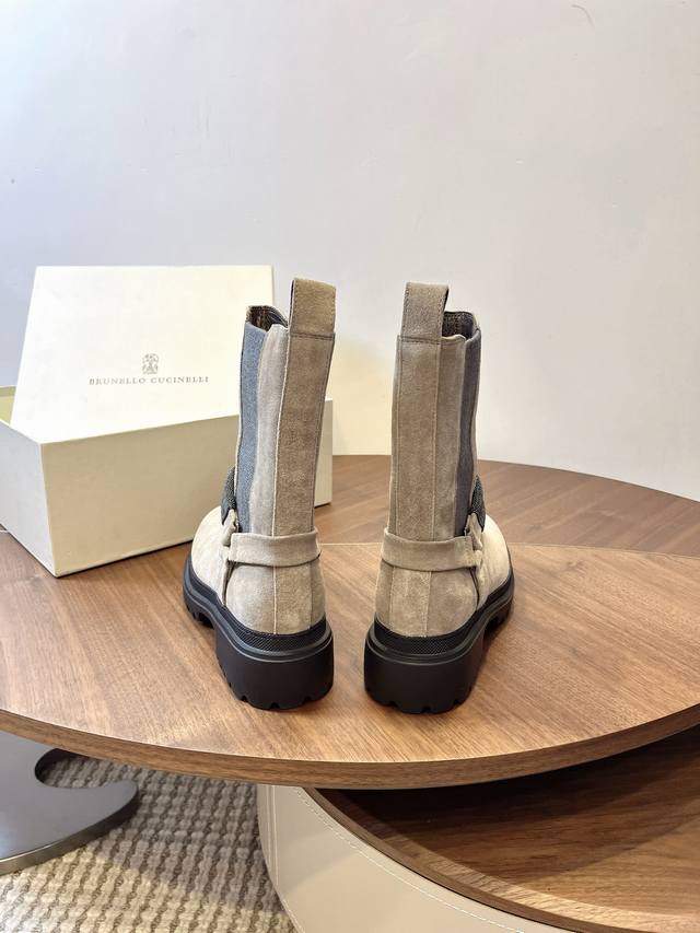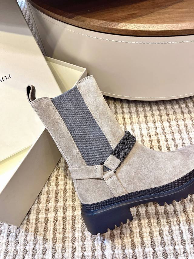 Brunello Cucinell布鲁奈罗库奇内利 25S早秋新款 小碎钻环扣厚底弹力短靴 非常百搭的经典款,鞋面的环扣小钻带,非常时髦也十分具有品牌特色,靴筒
