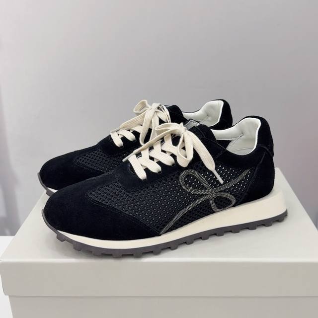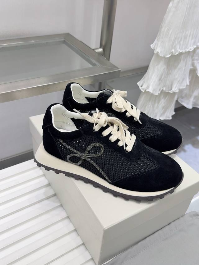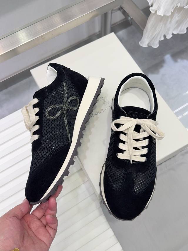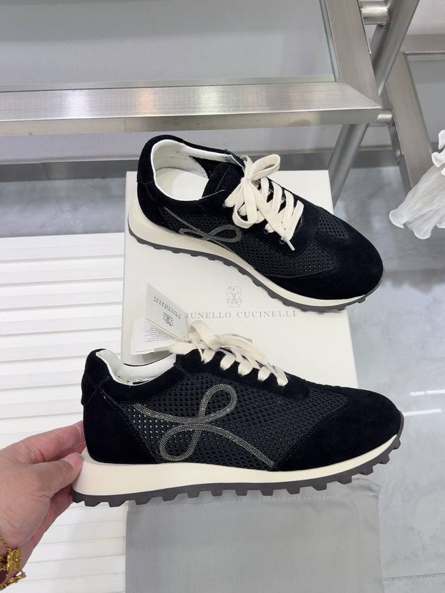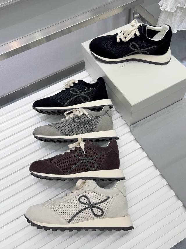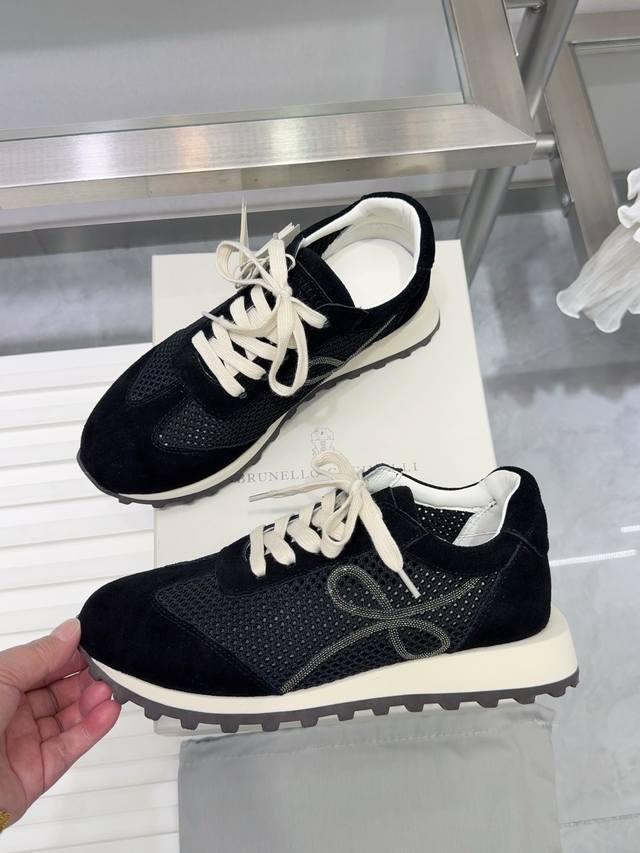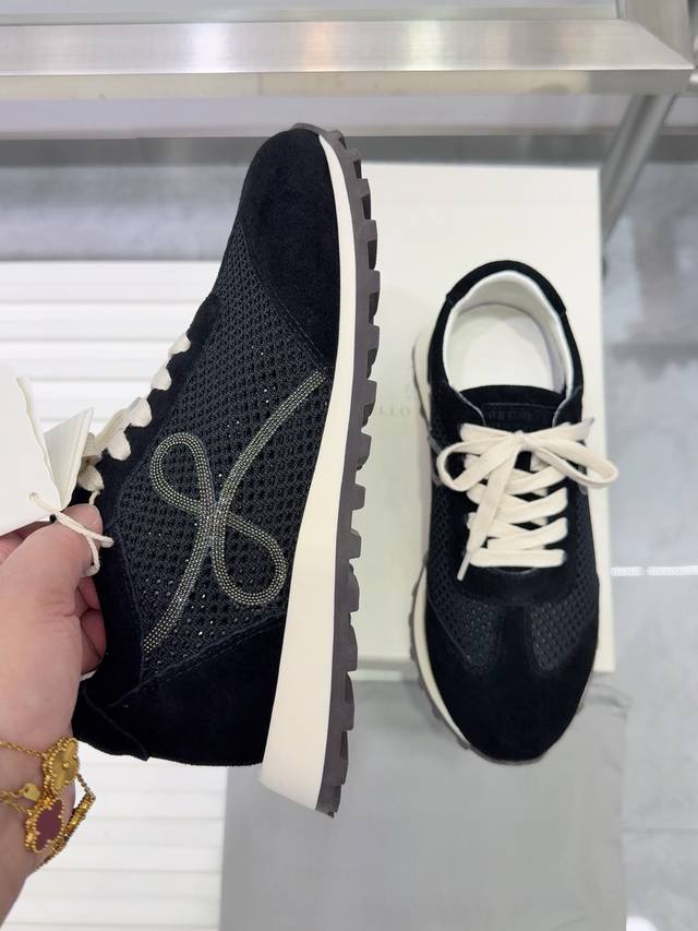 Brunello Cucinelli 女士镶珠装饰飞织休闲运动鞋Bc新款秋冬4色新品女士条纹麂皮单鞋:羊皮垫.装饰镶珠运动鞋 款号: 鞋面:一比一复刻高丝光、牛
