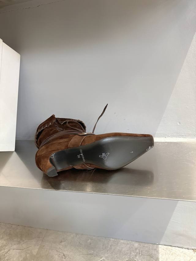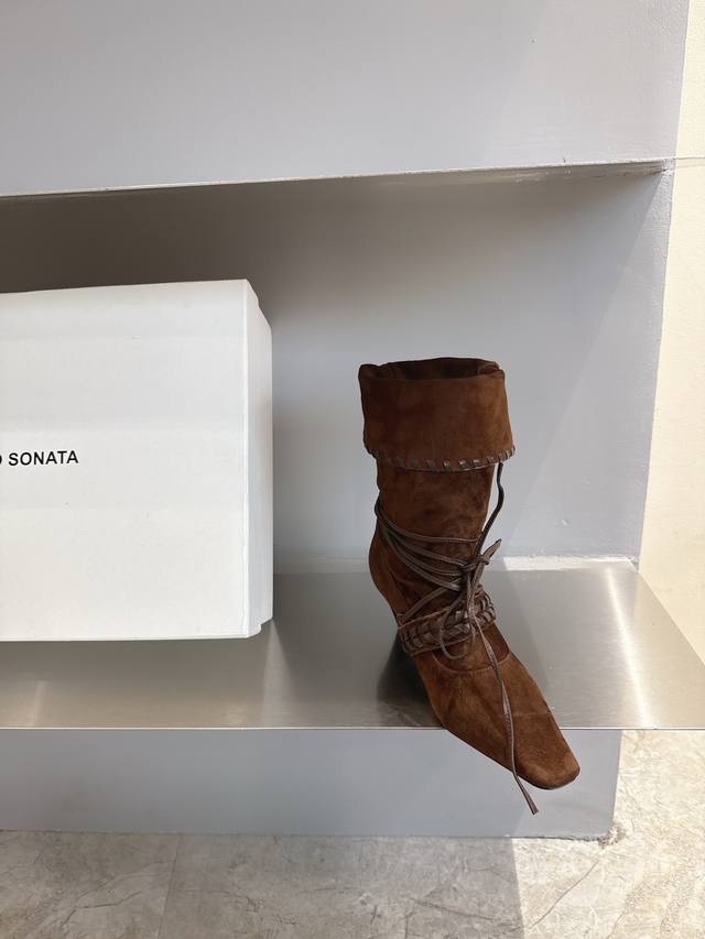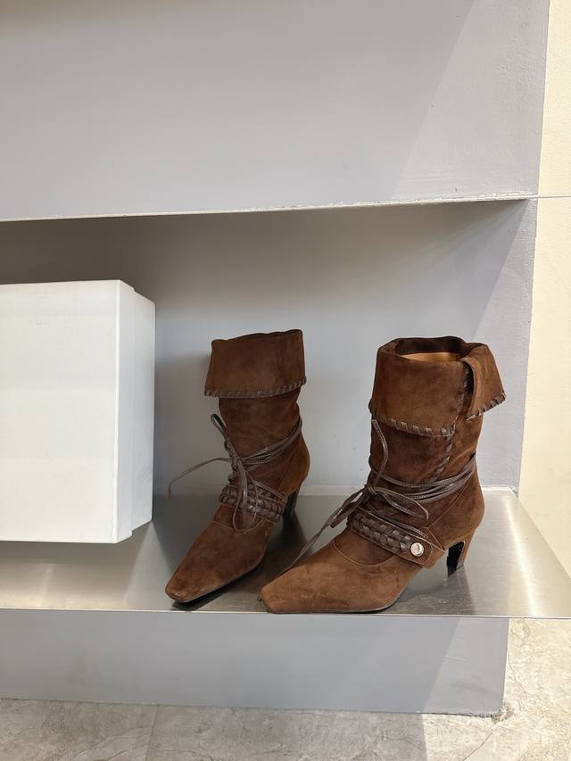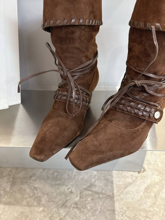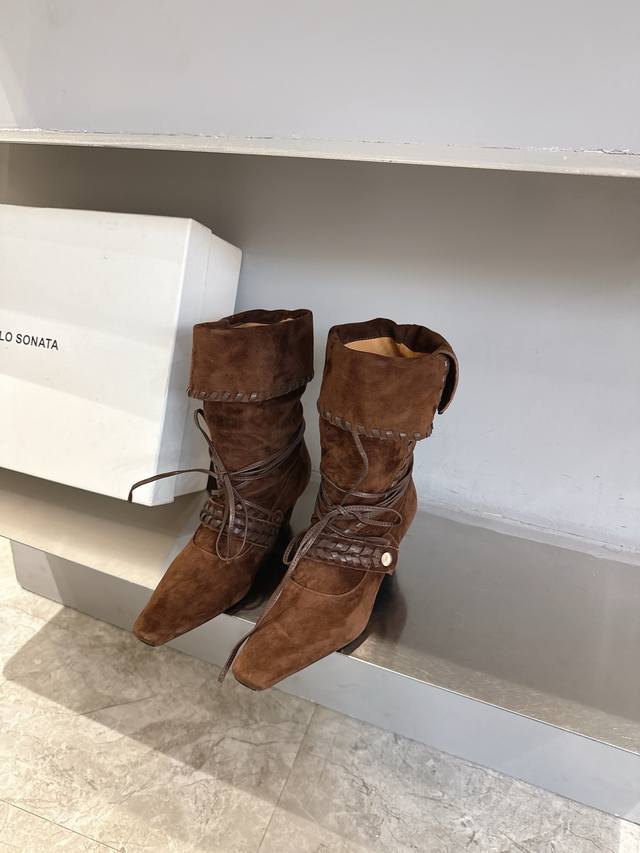 Cello Sonat*25Aw新品游牧风复古麂皮编织中靴 把复古时髦玩明白了 尖头皮质+绑带设计 极致柔软细腻搭配同色系编织条带 自带神秘故事感。 卷边靴筒藏