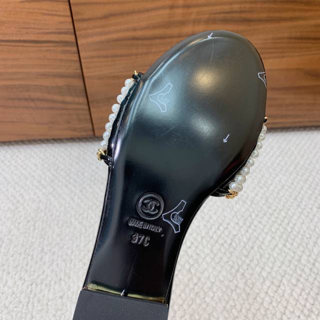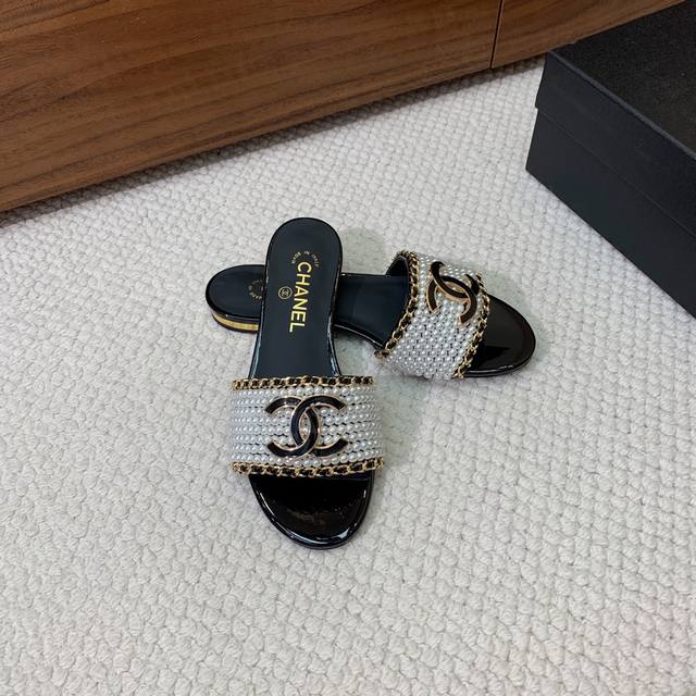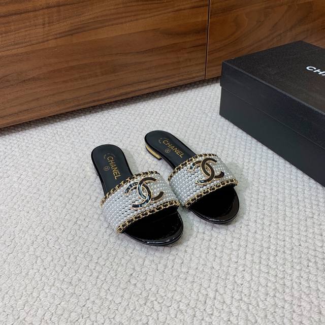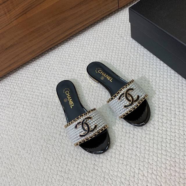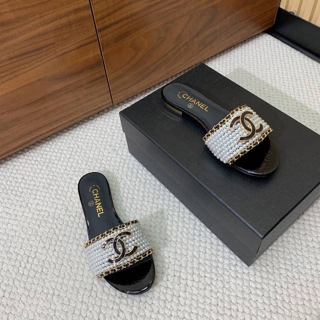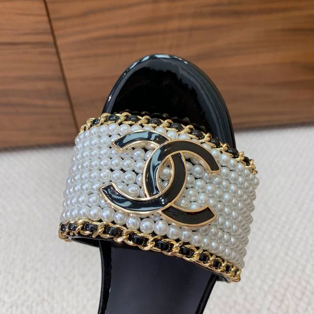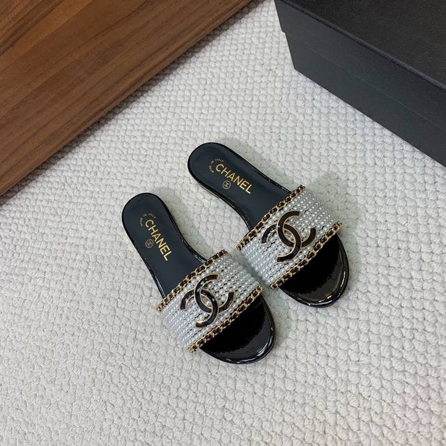 Chan*L珍珠拖鞋。浓浓的中古典雅气息。鞋面珍珠配链条。羊皮垫脚,真皮大底。码数:35-42 40、41、42定制不退换 批: