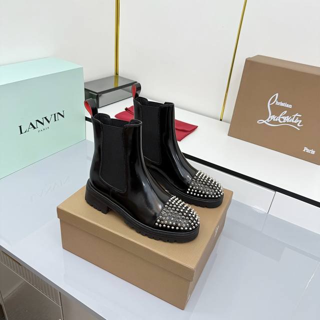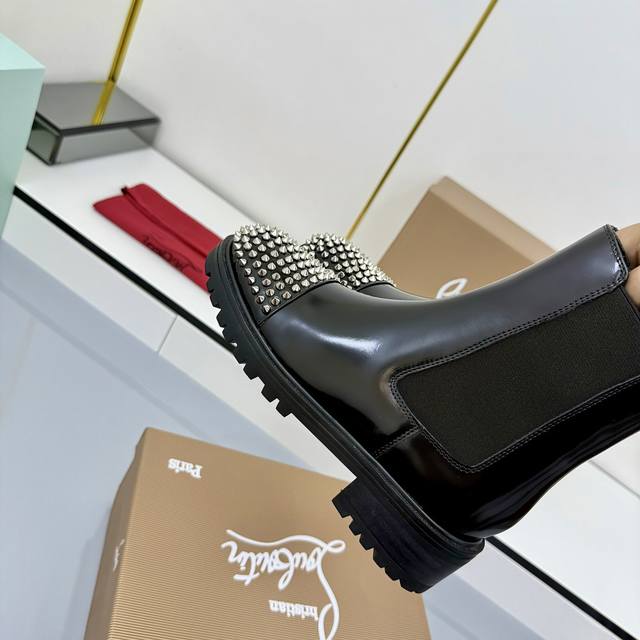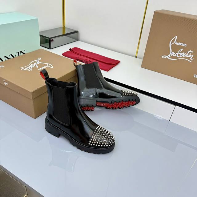 Christian Louboutin秋冬新品爆款. 上图转发必卖. 原版开发高品质专柜新品、原版套宣饱满帅气靴形、鞋头铆钉设计、配加顶级工艺双层黑红配色组合大底、色度光泽质感完全媲美正品、种种工艺加上明星上脚 名人街拍都是爆卖点、也是本厂强烈推荐的理由! 材质:进口开边珠牛皮面配电镀五金铆钉!内里垫脚全牛皮!顶级工艺不是一般工厂p可做到的组合双色橡胶大底、 DDD 配置专柜原版包装 DDD Szie: 35-40 41可订做 DDD