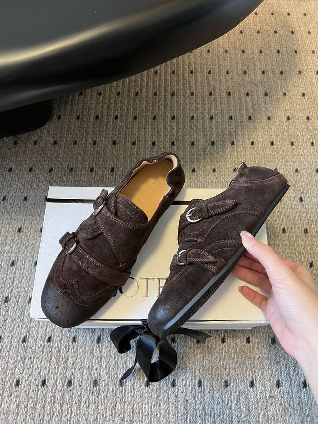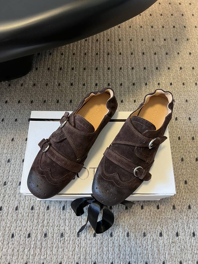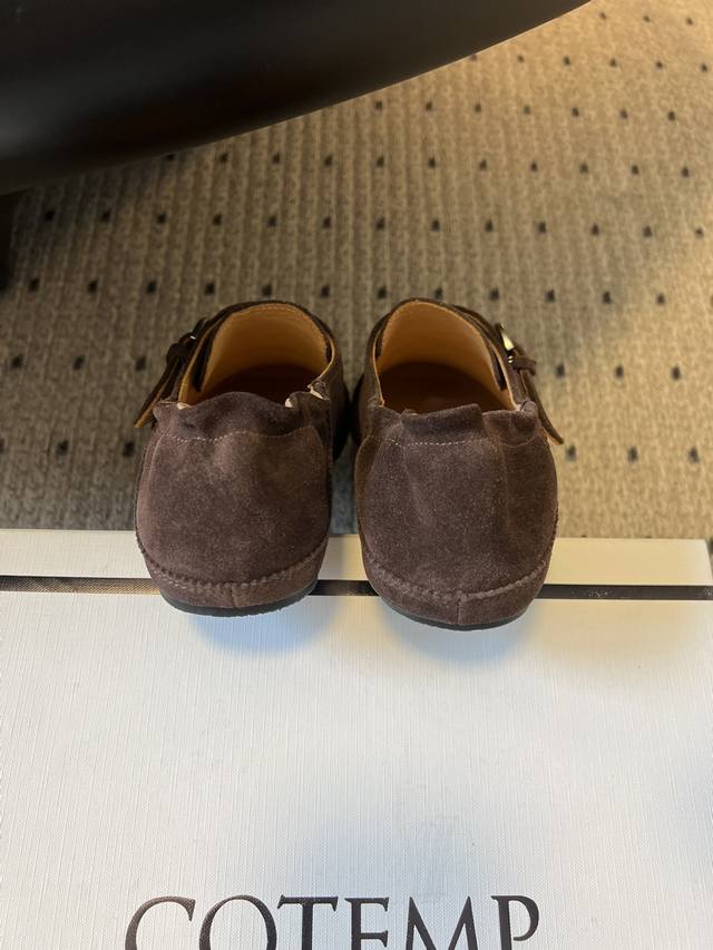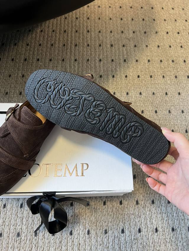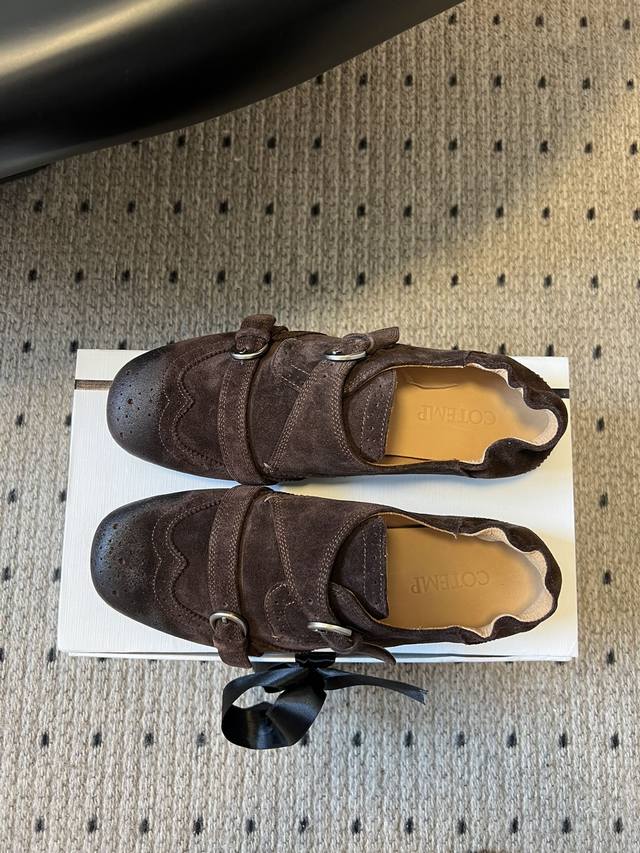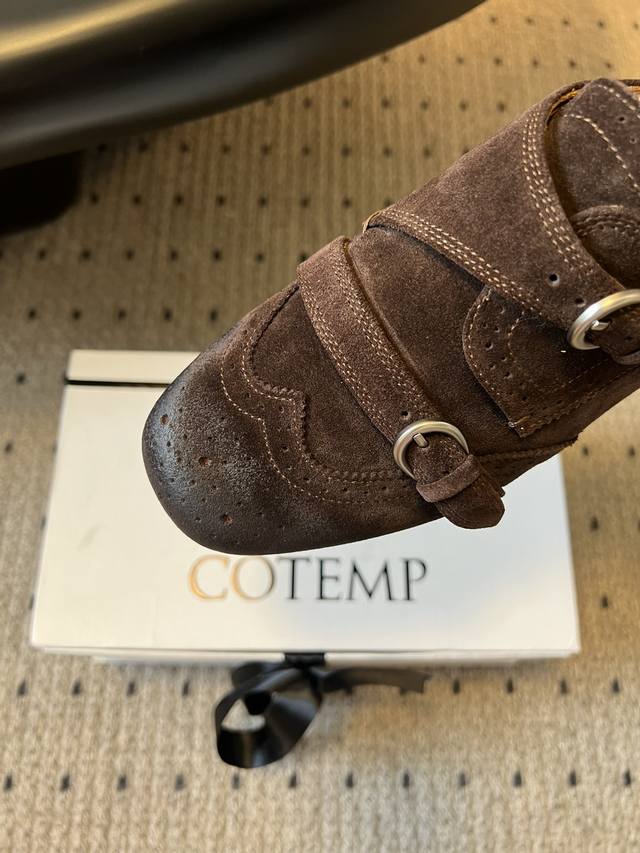 Cotemp 复古双扣雕花乐福鞋 DDD 融合复古与现代感,采用孟克鞋结构,双扣带设计经典且具辨识度;鞋头的布洛克雕花元素增添复古精致感,鞋口的波浪形边缘则注入柔美元素,平衡硬朗风格。 DDD 鞋面运用优质皮革 麂皮材质,质感细腻;部分款式采用做旧擦色工艺,营造复古做旧氛围,提升单品的独特性与复古韵味。鞋型宽松舒适,适合日常穿搭;波浪形鞋口设计贴合脚踝,既美观又能减少摩擦,提升穿着舒适度。 DDD 鞋面:牛皮 牛反绒 DDD 内里:牛皮 DDD 大底:橡胶大底 DDD 增高:4Cm DDD Size:35