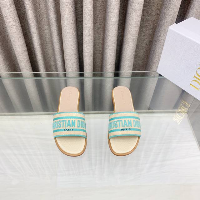 dior2025春夏新款Dway平底一字拖拼色女鞋 Cd字母Logo立体刺绣圆柱跟凉鞋 方头粗跟凉拖鞋 原版开发市面顶级版本