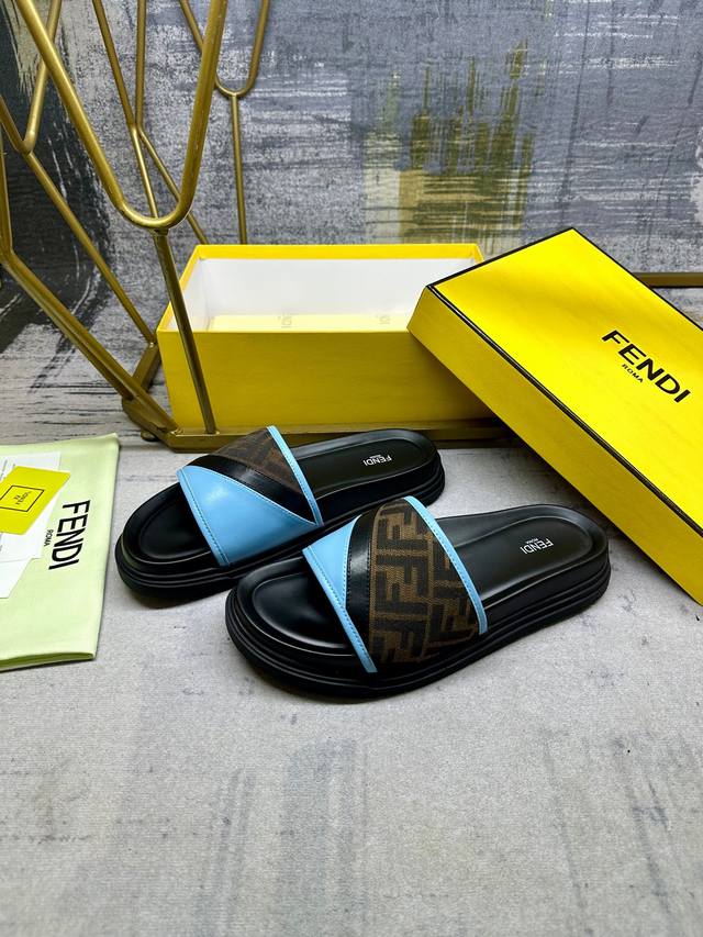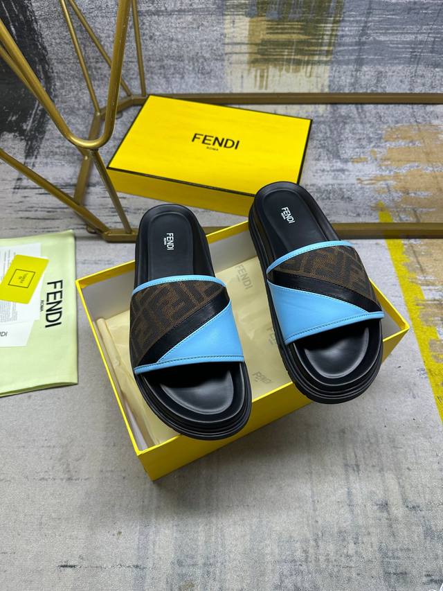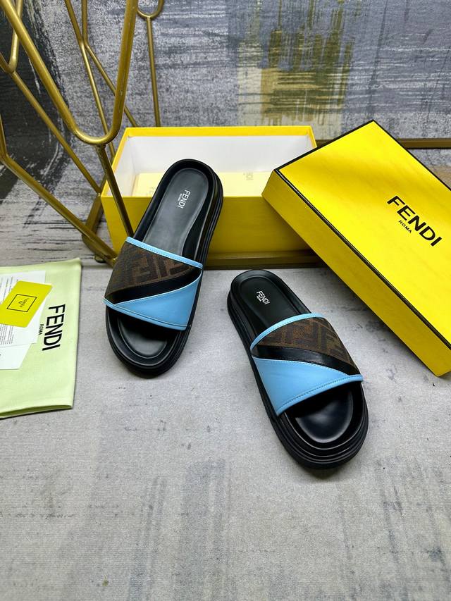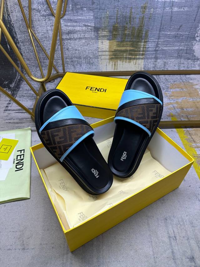fendi最新宽衬垫带拖鞋,棕色Ff提花和蓝色牛皮拼接 ,黑带斜向镶饰,防滑橡胶鞋底,男38-45码,