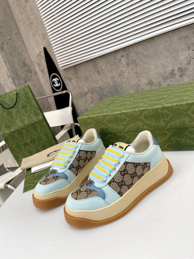 G家最新款胖嘟嘟厚底脏脏鞋 P440 6Cm增高鞋~~ 鞋面擦色牛皮拼接经典双G布面料,毛巾布里细腻吸汗透气,垫脚乳胶注塑一体,6Cm厚Tpu双色底 情侣款35