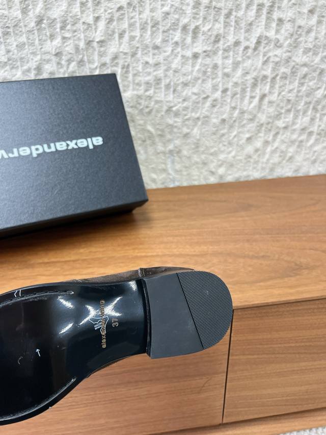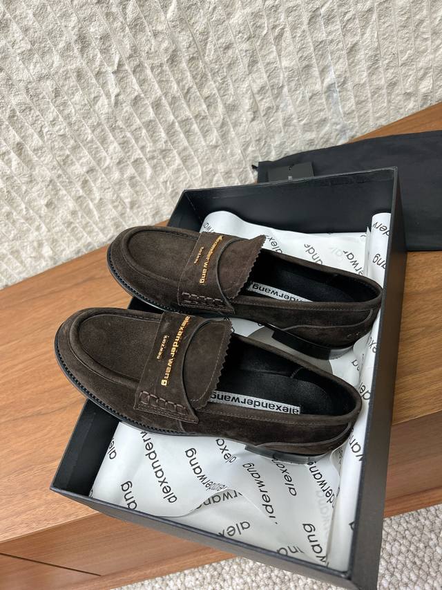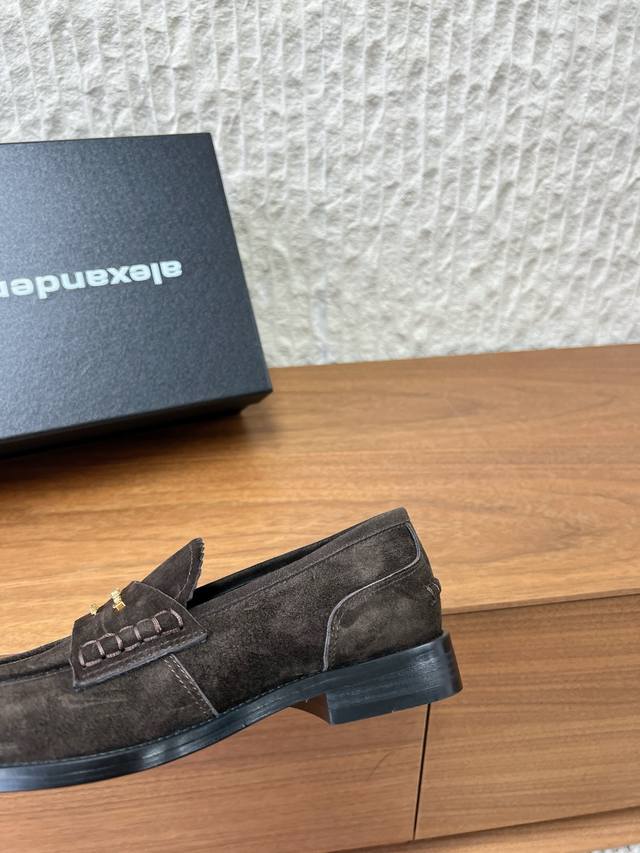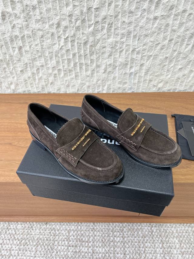 FFF G172 Alexander Wang 亚力山大王 26Ss早春新款 Carter 徽标装饰 乐福鞋 DDD 这款Alexander Wang乐福鞋选用牛麂皮,翻毛皮质感细腻,低调奢华。 DDD 鞋面有金属字母标识,品牌感满满。经典乐福鞋设计,简约大方,通勤休闲都能轻松驾驭气。 DDD 羊皮内里,穿着舒适。秋冬季节超百搭,无论正装还是休闲都能轻松Hold住! DDD 面料:采用原版进口麂皮 牛皮 DDD 内里垫脚:羊皮 DDD 大底:原版定制意大利真皮大底 DDD Size:35-39 40.41