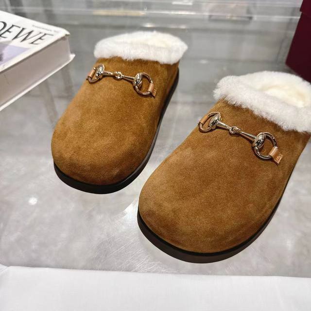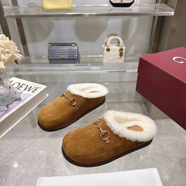 / Gg穆勒羊毛拖鞋采用高丝光牛反绒面,精心打造!以现代视角烦新诠释品牌金典元素。超经典马衔扣以浅金色调匠心呈现,全部美丽奴羊毛垫脚、羊毛里橡胶防滑鞋底。女款35-