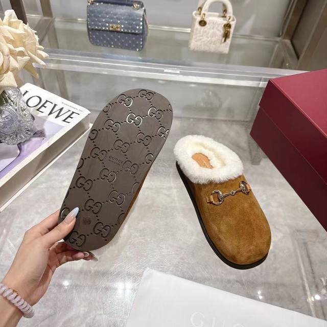 Gg穆勒羊毛拖鞋采用高丝光牛反绒面,精心打造!以现代视角烦新诠释品牌金典元素。超经典马衔扣以浅金色调匠心呈现,全部美丽奴羊毛垫脚、羊毛里橡胶防滑鞋底。女款35-40码,厂