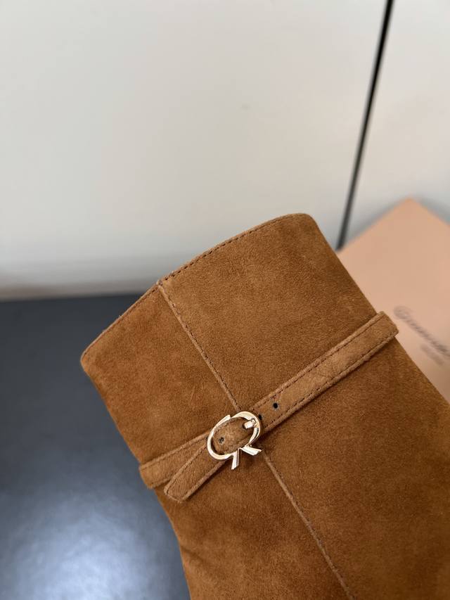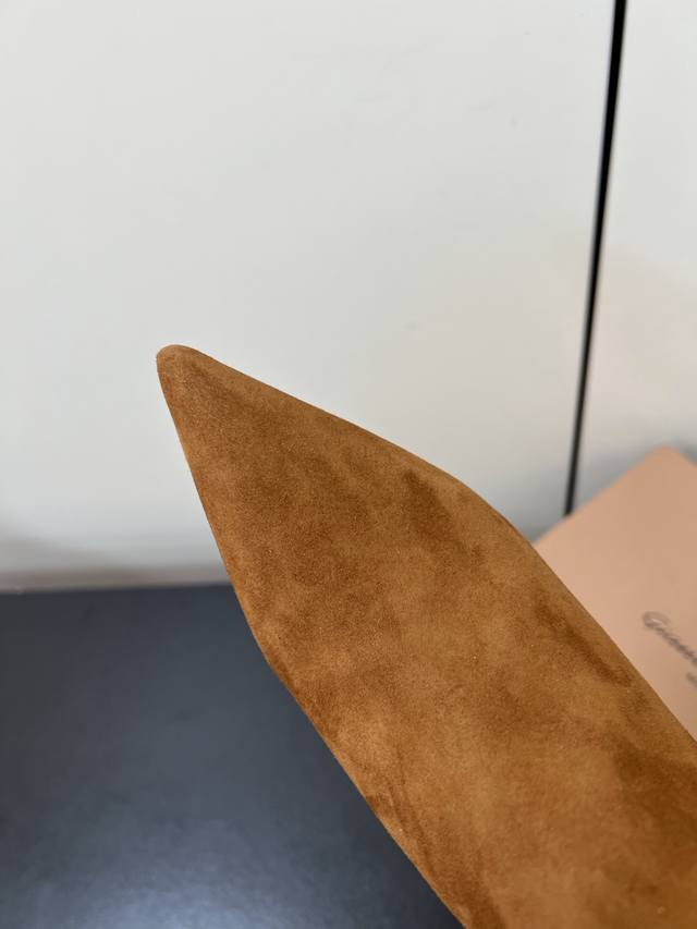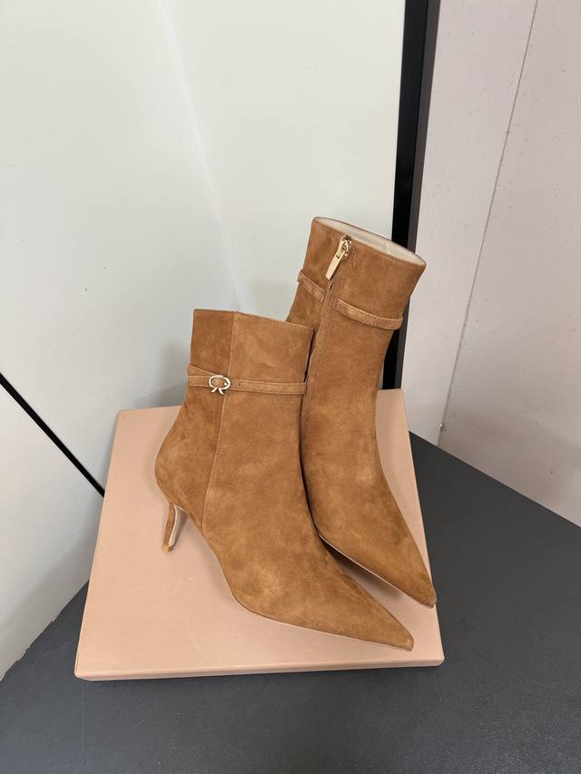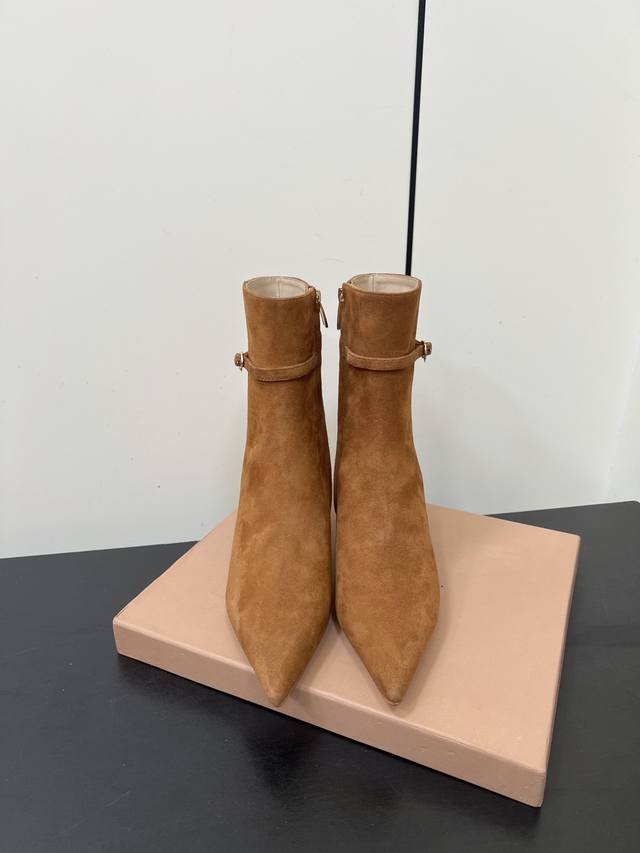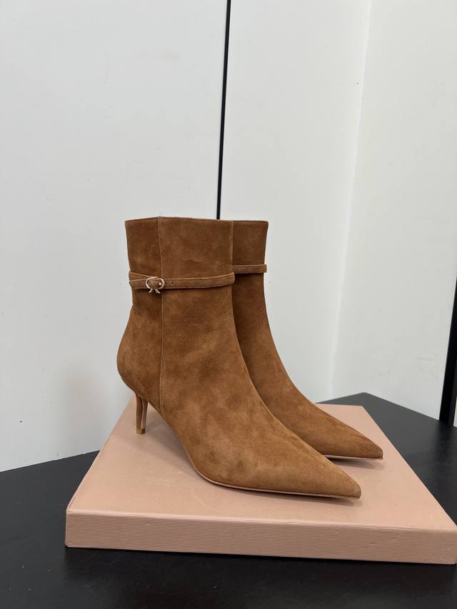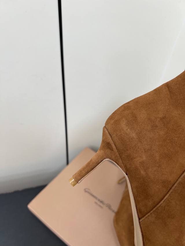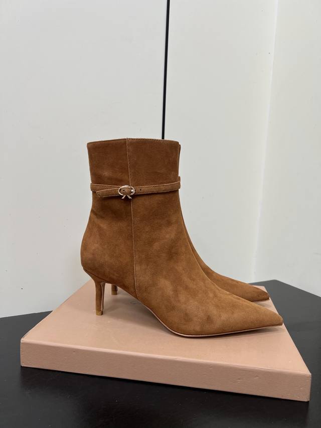 Gianvito Rossi25S秋冬新款 罗西 Gr尖头及踝靴侧拉链R扣细跟短靴高跟靴子 DDD 鞋面采用绒面革,质感柔软细腻,自带奢华高级感,同时为整体造型增添了一份复古优雅气质。 DDD 经典的尖头设计,能自然拉长腿部线条,修饰脚型,是永不过时的“显腿长”利器;鞋筒高度适中,属于踝靴范畴,适配多种裤装 如牛仔裤、小黑裤 或裙装 如连衣裙、半身裙 ,穿搭场景广泛。 DDD 鞋身侧面有一条 横饰带,饰带上点缀着品牌标志性的 金属扣环‘R’元素变体,常以金属配件提升奢华感,为简约的靴身增添了精致细节与辨识