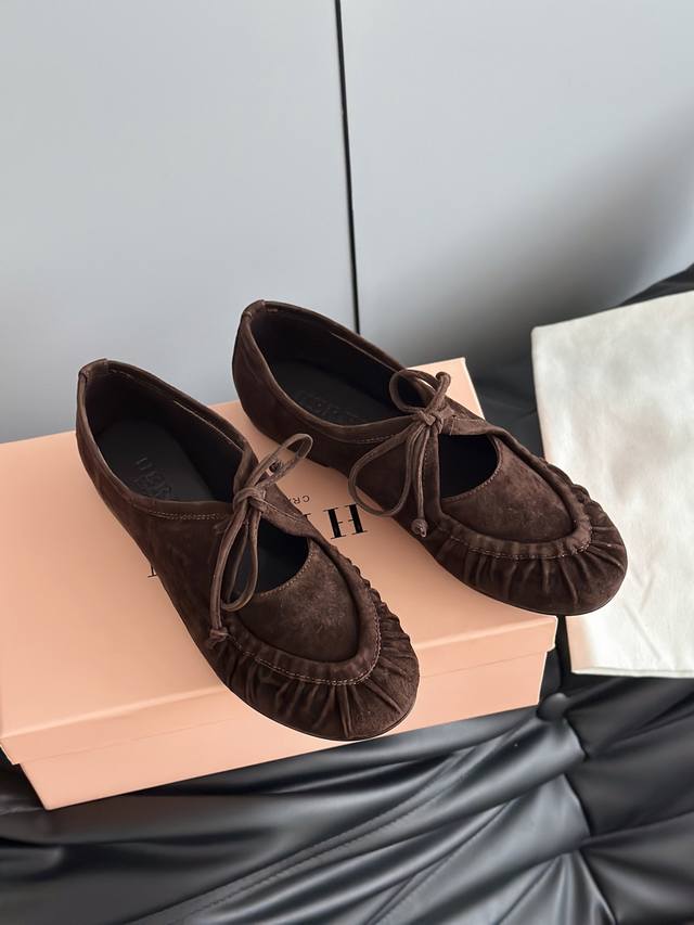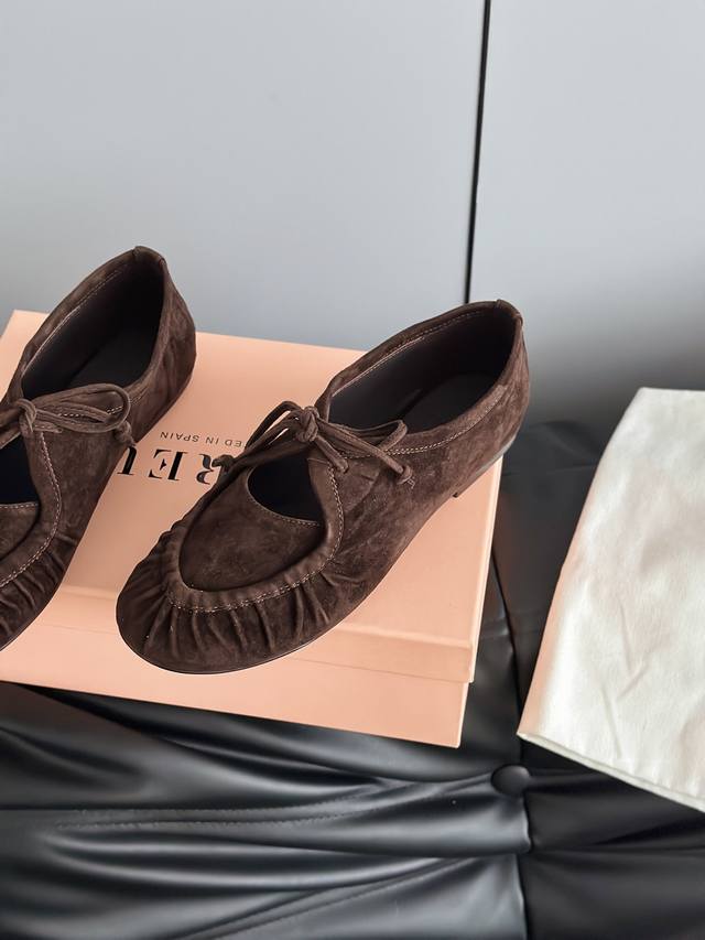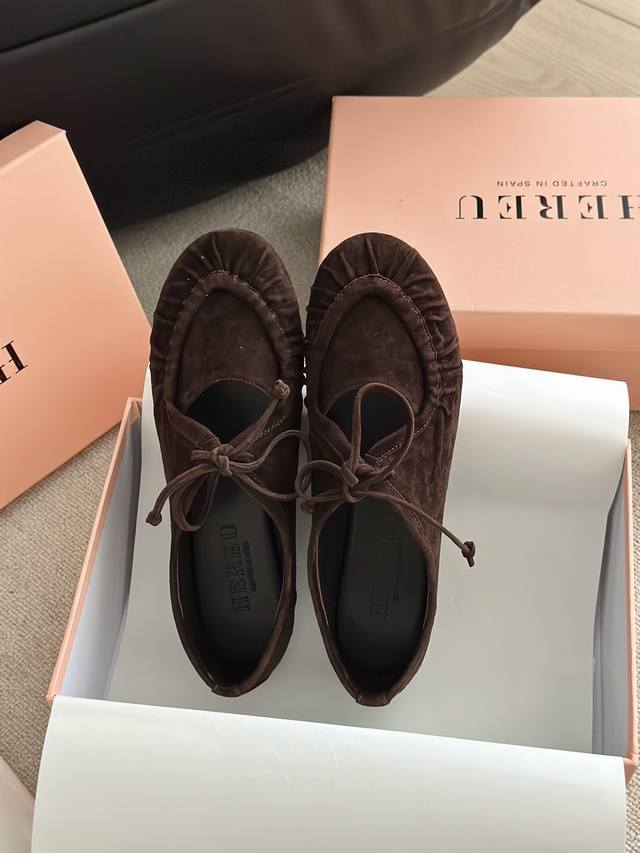 Hereu西班牙早秋新款系带芭蕾鞋褶皱蝴蝶结玛丽珍乐福鞋 简洁大方。鞋头部分微微上翘,线条流畅自然,既美观又能减少行走时鞋头与地面的摩擦。鞋身前部采用了系带蝴蝶