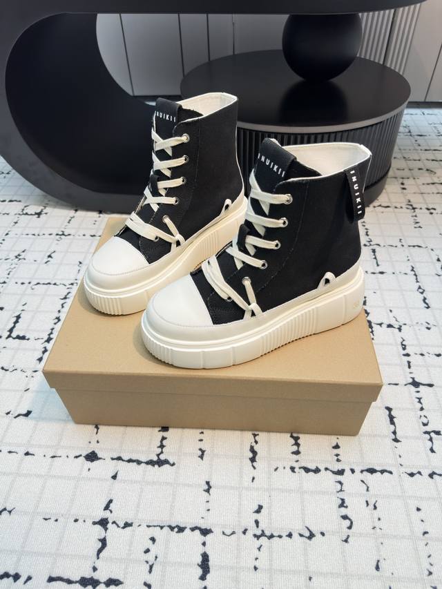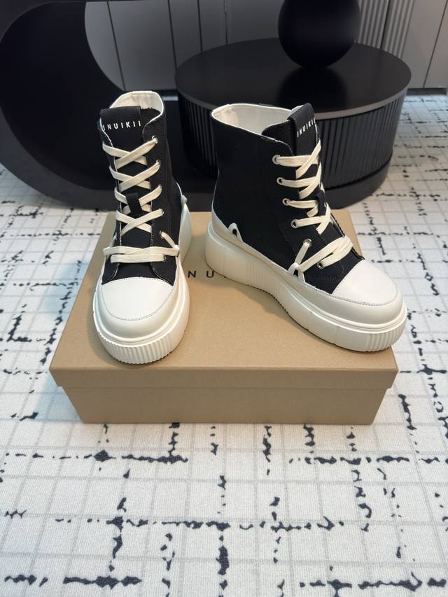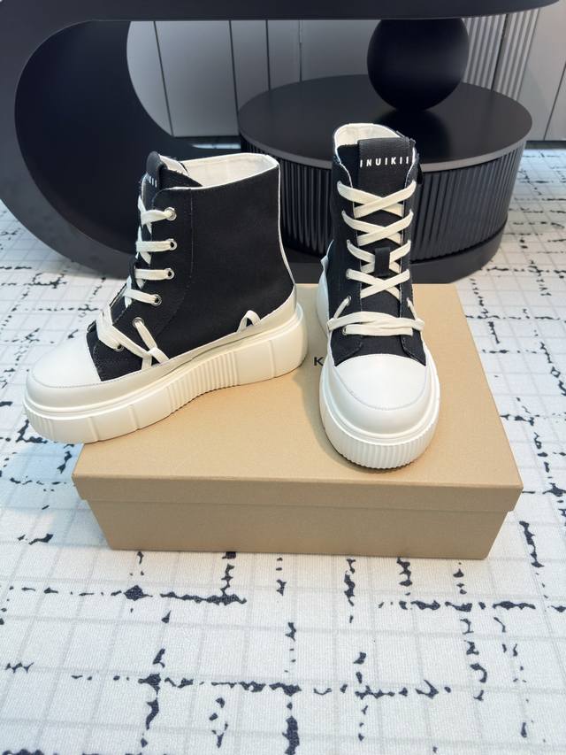 Inuikii新款高帮饼干鞋!主打好看 ,标志性解构化廓形,鞋身以简约立体线条,鞋面覆盖透气帆布面料,注入上层柔 软提升脚感,采用廓形橡胶厚底,穿着显瘦显腿长,