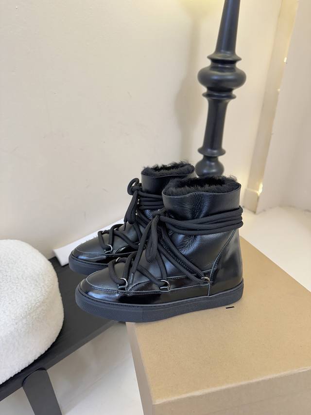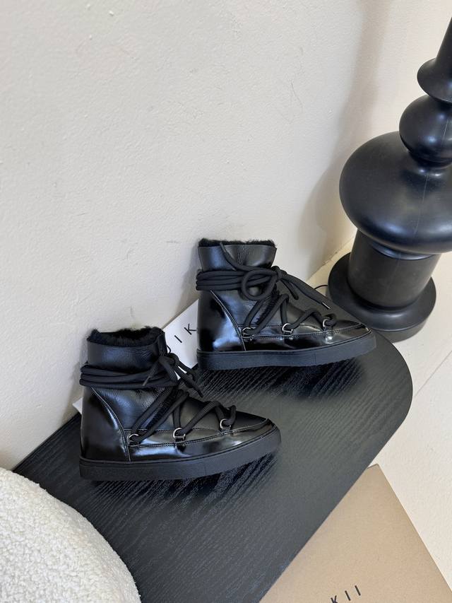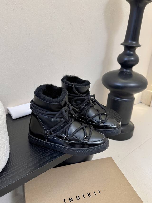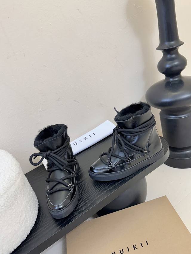 Inuikii雪地靴 .鞋面牛毛一体牛油皮,光泽细腻柔软加厚的面料不仅增加舒适度且兼具保暖效果! 鞋面:采用原版皮毛一体牛油皮 内里:真羊毛里 垫脚:真羊毛 大