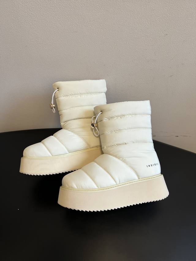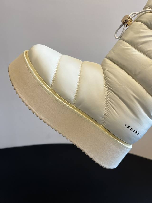 Inuikii 25Ss新款防水羽绒雪地靴 采用羽绒填充设计,靴内形成温暖舱室,能有效抵御严寒,适合冬季低温环境穿着。鞋面选用防水面料,搭配防滑橡胶大底,应对雪