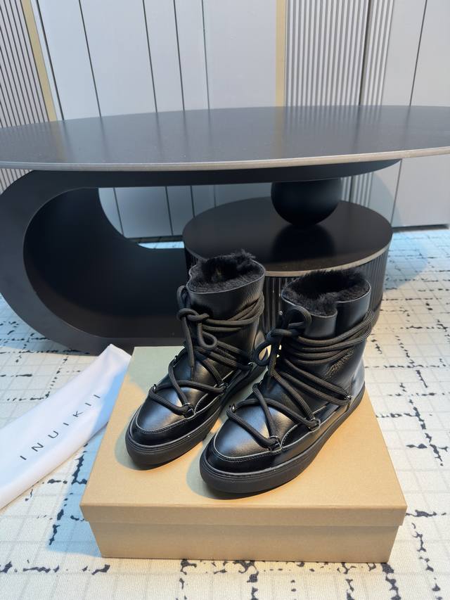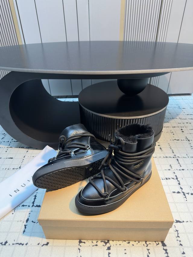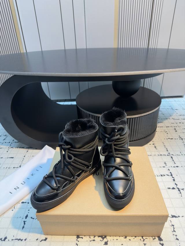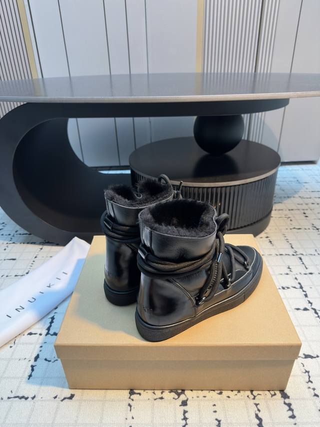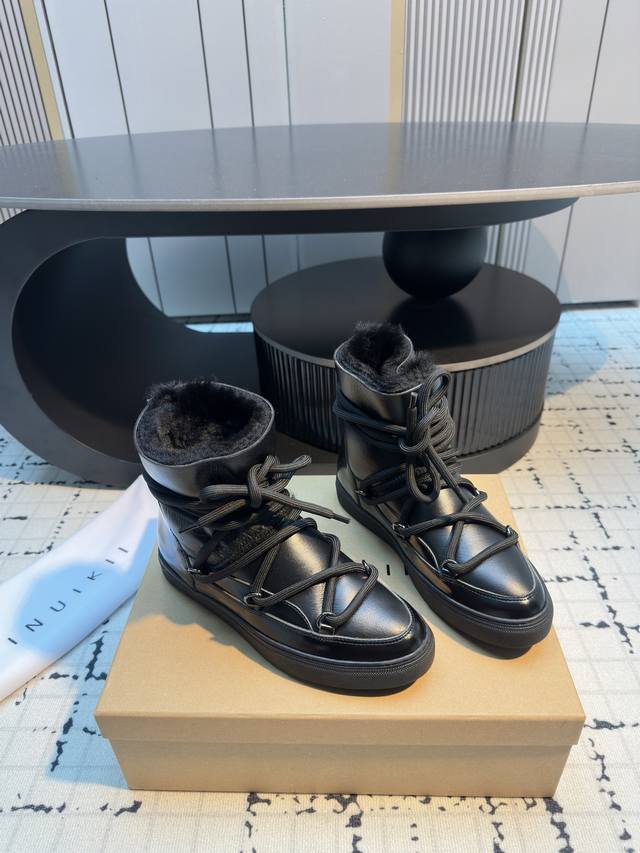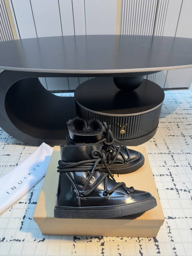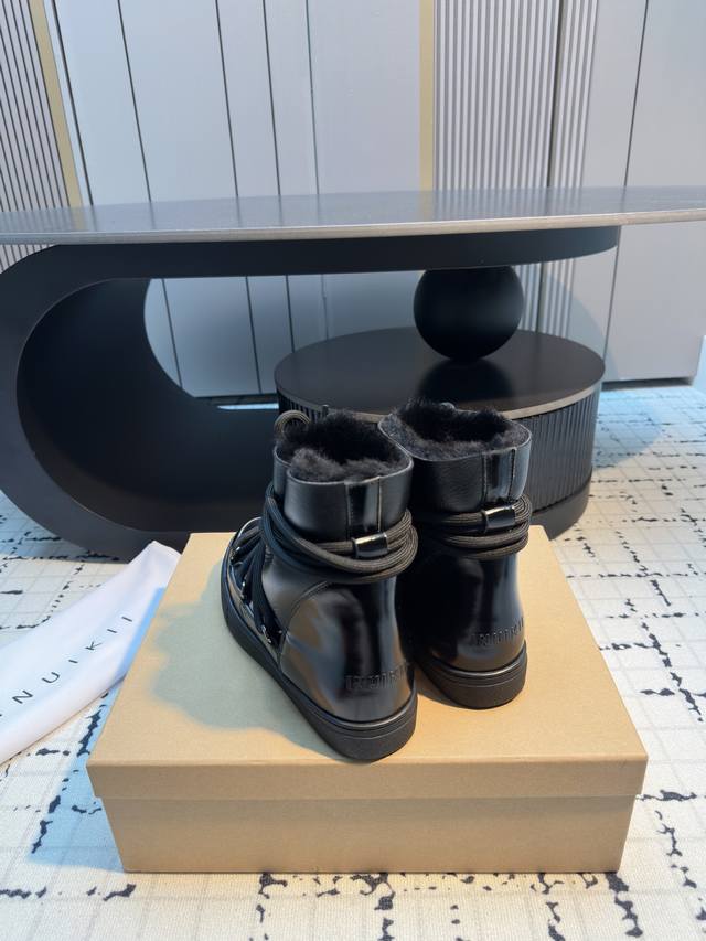 Inuikl* 25Ss秋冬新款绑带雪地靴 DDD 鞋面采用黑色皮革材质,质感细腻且有光泽有质感;鞋口处有毛绒内衬,厚实的鞋底具有较好的防滑和耐磨性能,适合在多种地面环境下穿着;毛绒内衬则能在寒冷的天气里为脚部提供温暖,适合冬季穿着。 DDD 采用了多鞋带交叉系带设计,增加了鞋子的时尚感和设计感,同时系带设计也便于调整鞋子的松紧度,提升穿着的舒适度;整体是短靴款式,风格偏向于时尚休闲,且黑色的配色比较百搭,适合搭配多种风格的服饰。 DDD 材质:牛皮 DDD 内里:羊毛 DDD 大底:橡胶大底 DDD 增