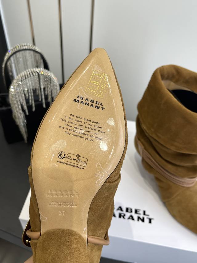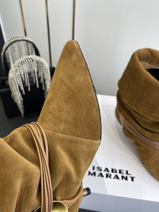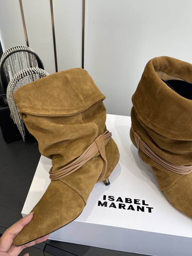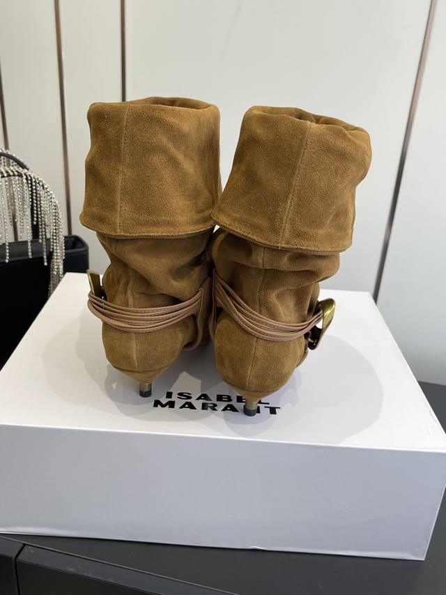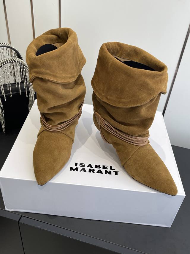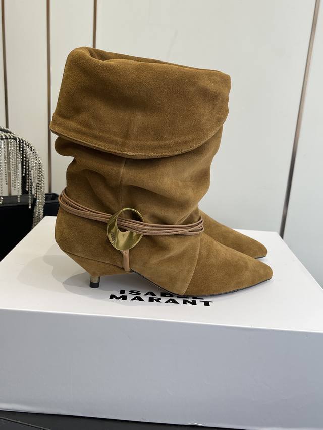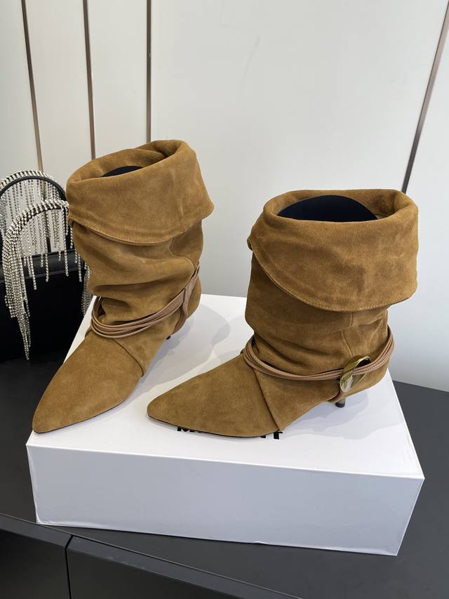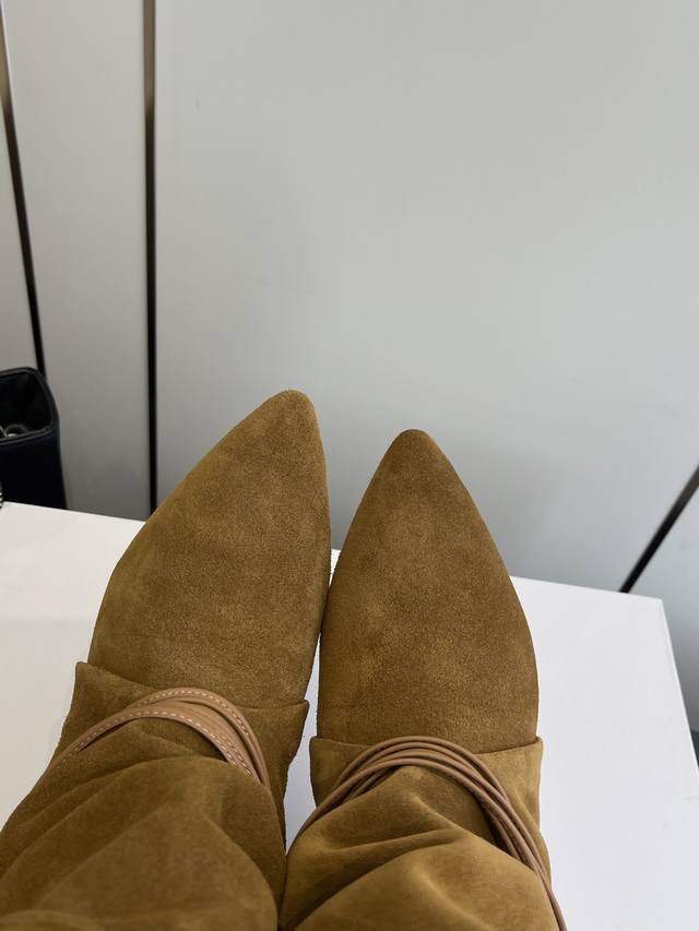 Isabel Marant 25Ss新款 麂皮小猫跟堆堆靴 采用绒面材质,呈现出温暖柔和的质感,自带复古氛围。鞋筒可翻折,增添随性风格;鞋身配有多圈棕色绑带,搭配金属圆环装饰,提升设计感与精致度;采用尖头设计,结合细跟,在修饰脚型的同时,增添女性优雅气质,且细跟设计相比高跟更易驾驭。 搭配带有复古花纹的中长裙,打造复古法式风格,适合日常出街或约会,尽显浪漫复古情调。 搭配黑色紧身裤或牛仔裤,上衣选择白色毛衣或简约衬衫,突出鞋子的设计感,打造简约又不失时尚的日常造型。 鞋面:牛皮 麂皮 内里:牛皮 大底:真
