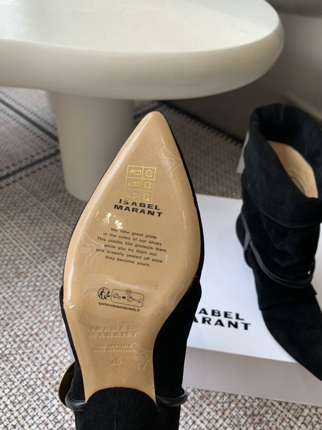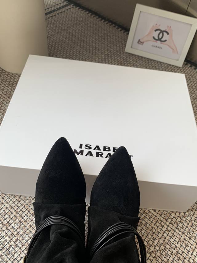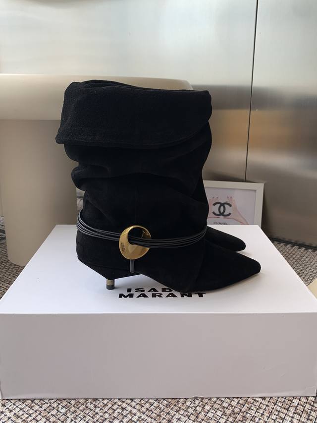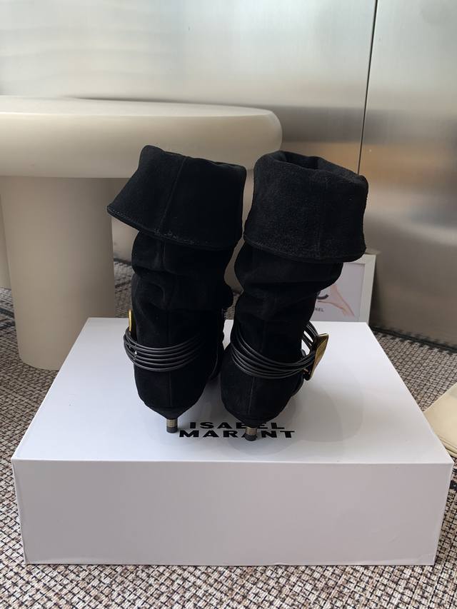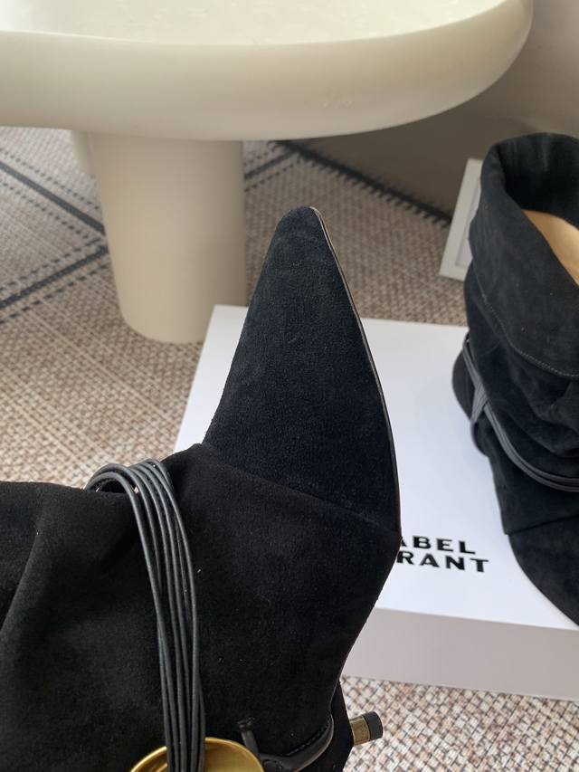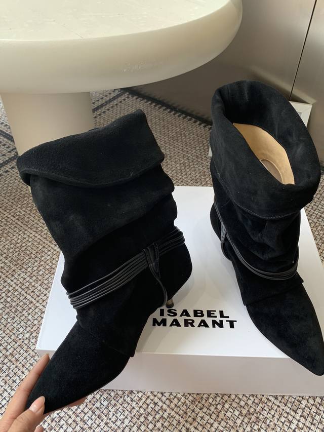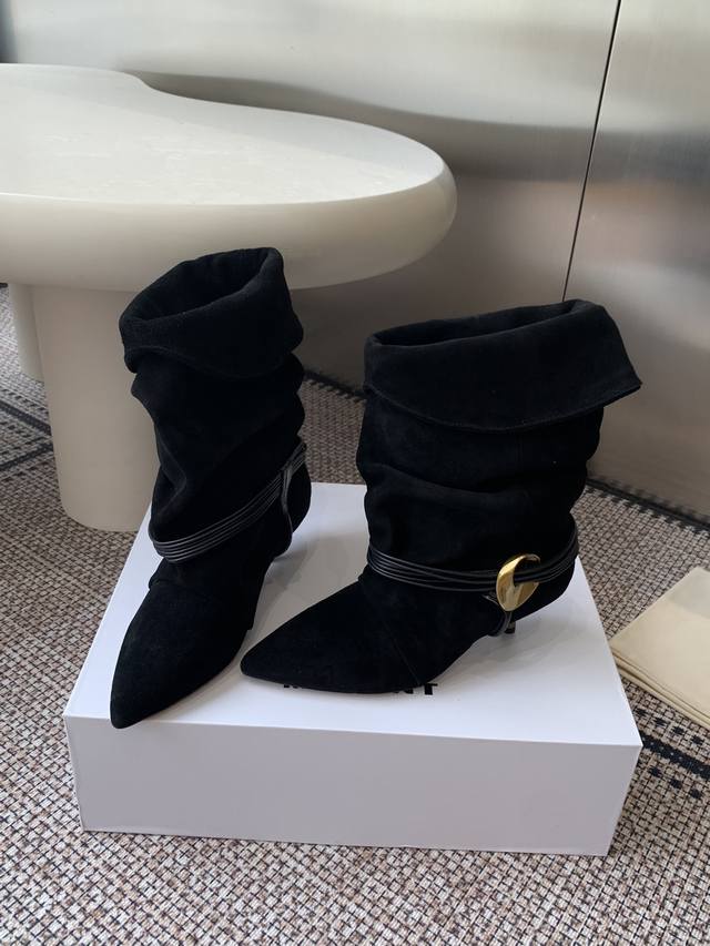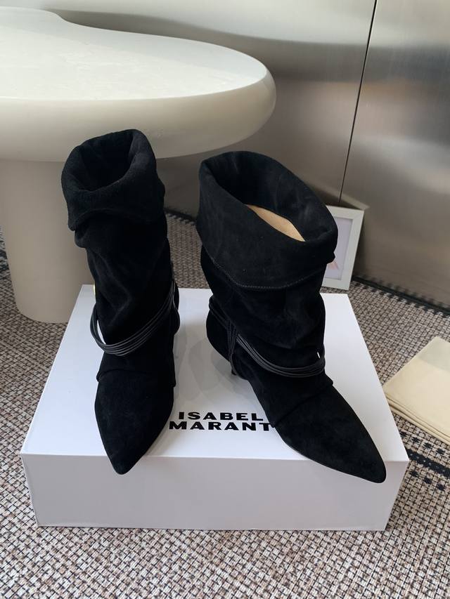 Isabel Marant 25Ss新款 麂皮小猫跟堆堆靴 采用绒面材质 呈现出温暖柔和的质感 自带复古氛围 鞋筒可翻折 增添随性风格 鞋身配有多圈棕色绑带 搭配金属圆环装饰 提升设计感与精致度 采用尖头设计 结合细跟 在修饰脚型的同时 增添女性优雅气质且细跟设计相比高跟更易驾驭 复古法式风格 适合日常出街或约会 简约又不失时尚的日常造型 鞋面牛皮 麂皮 内里牛皮 真皮大底 码数:35-40 40订做