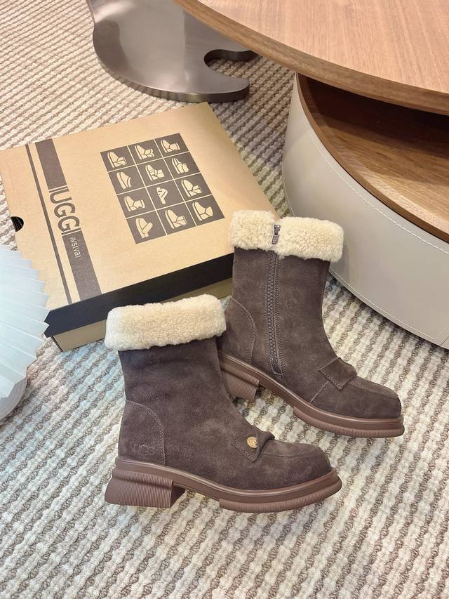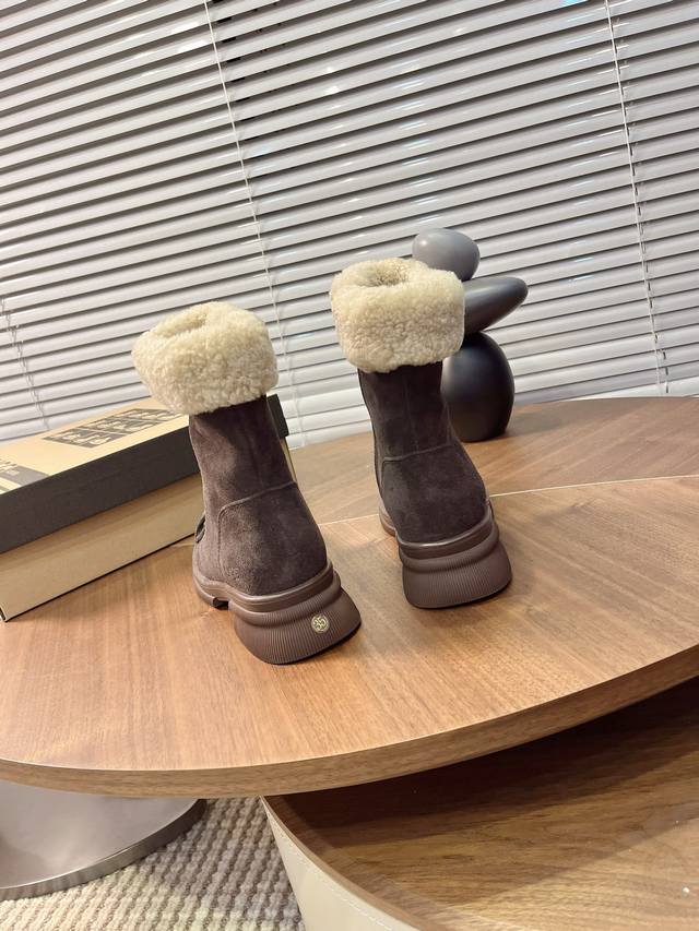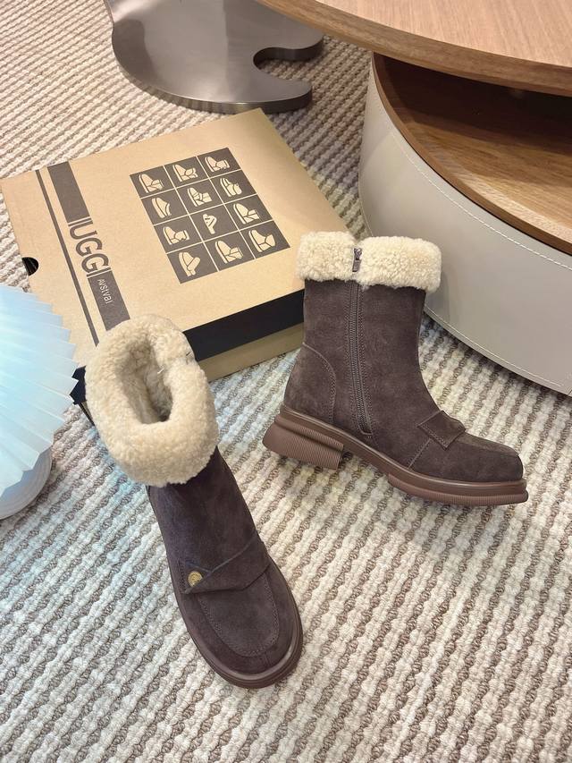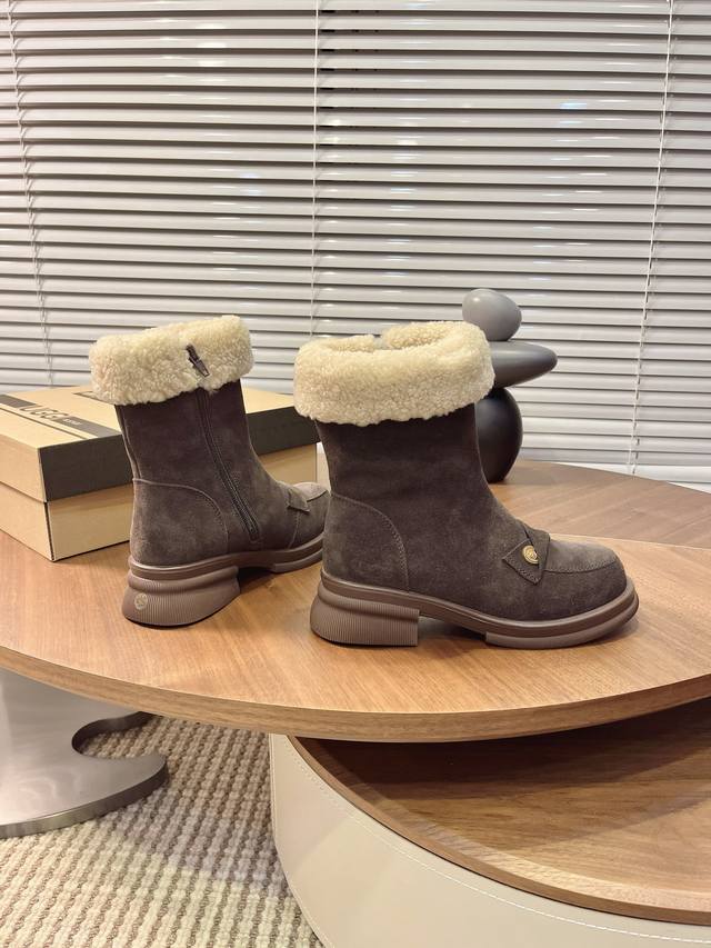 Iugg金币卷毛靴 “秋冬氛围感被这双靴拿捏住了~ 牛绒的质感+羊羔毛领口,暖呼呼又显质感,配纱裙或牛仔裤都很绝 踩在复古地毯上,像是把秋日的温柔都穿在了脚上