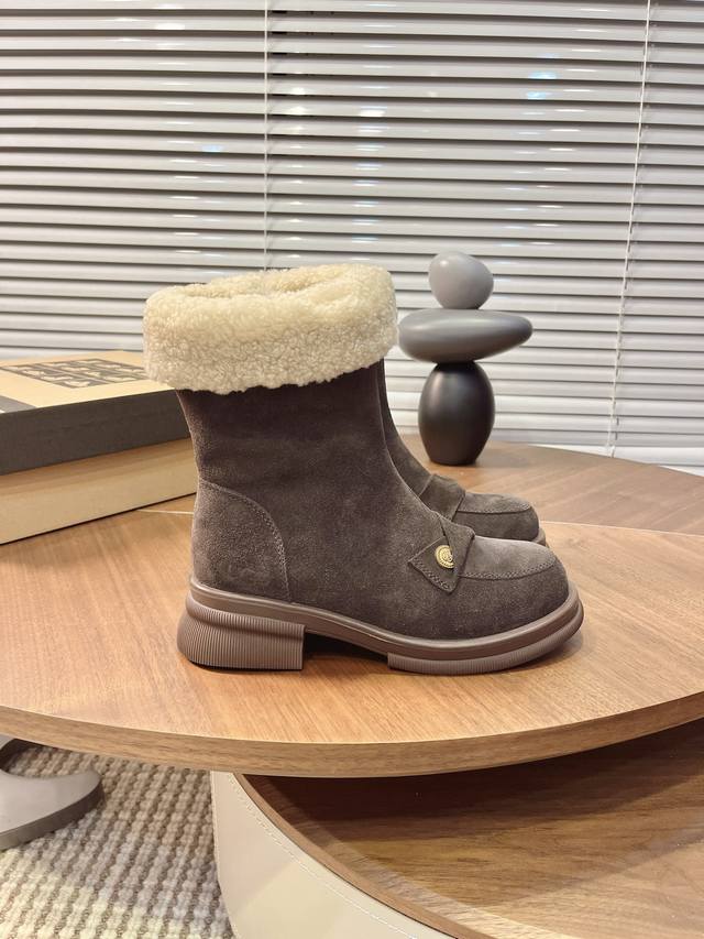 Iugg金币卷毛靴 DDD “秋冬氛围感被这双靴拿捏住了~ DDD 牛绒的质感+羊羔毛领口,暖呼呼又显质感,配纱裙或牛仔裤都很绝 DDD 踩在复古地毯上,像是把秋日的温柔都穿在了脚上 DDD 码数:35-40 DDD