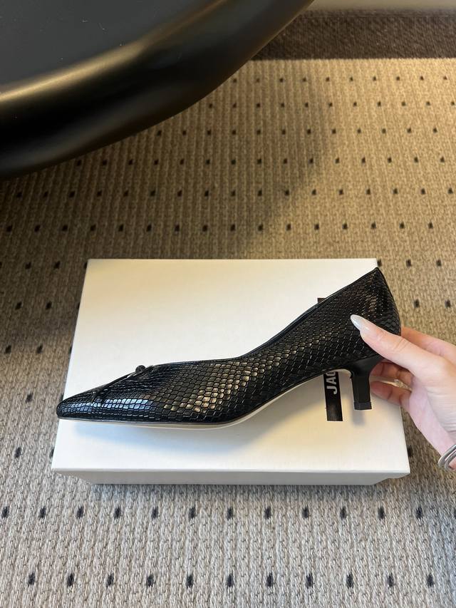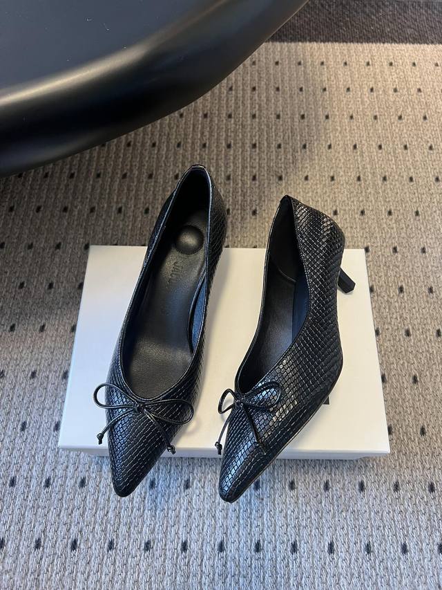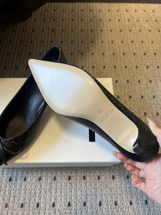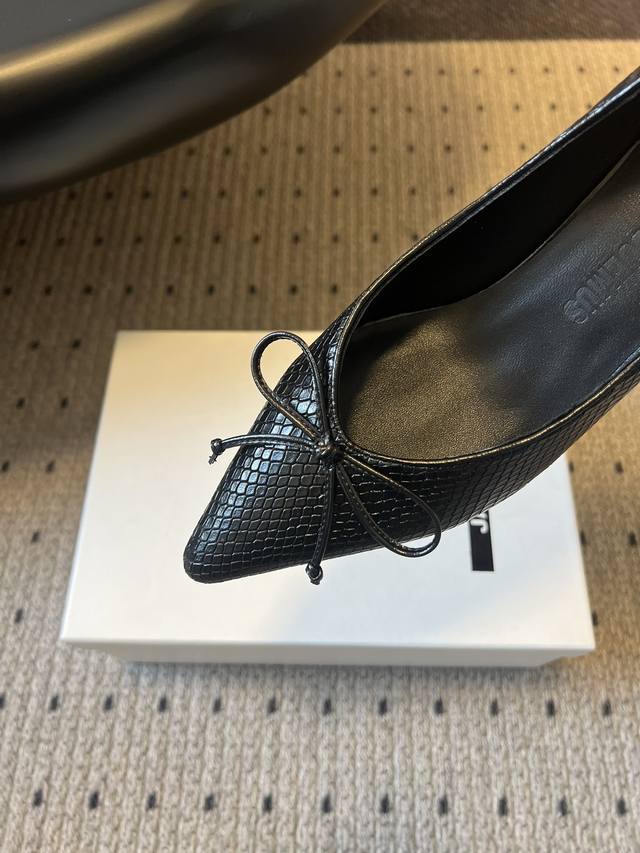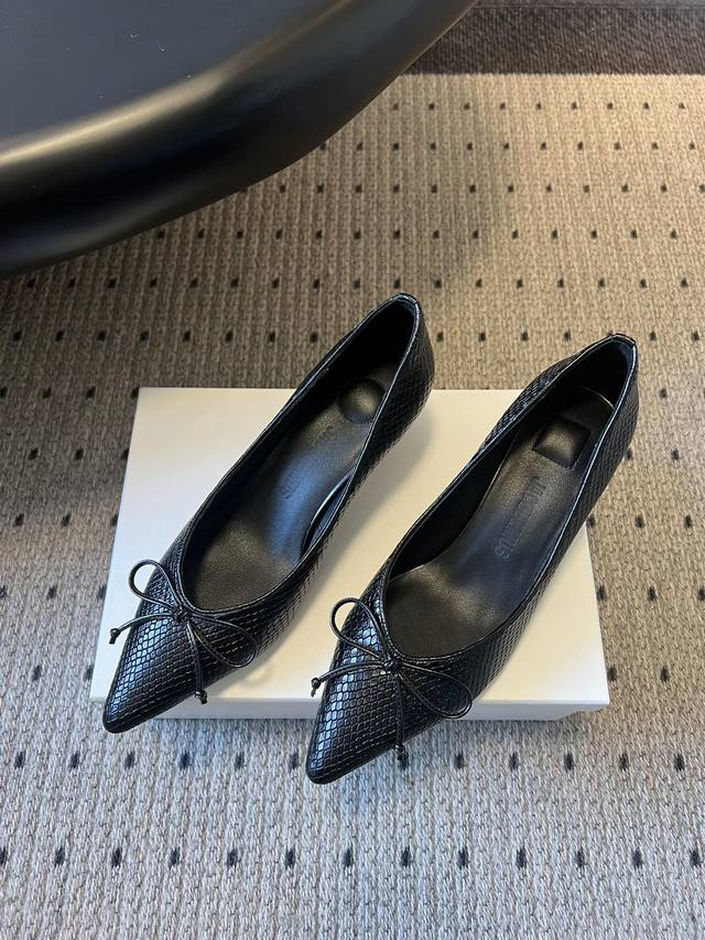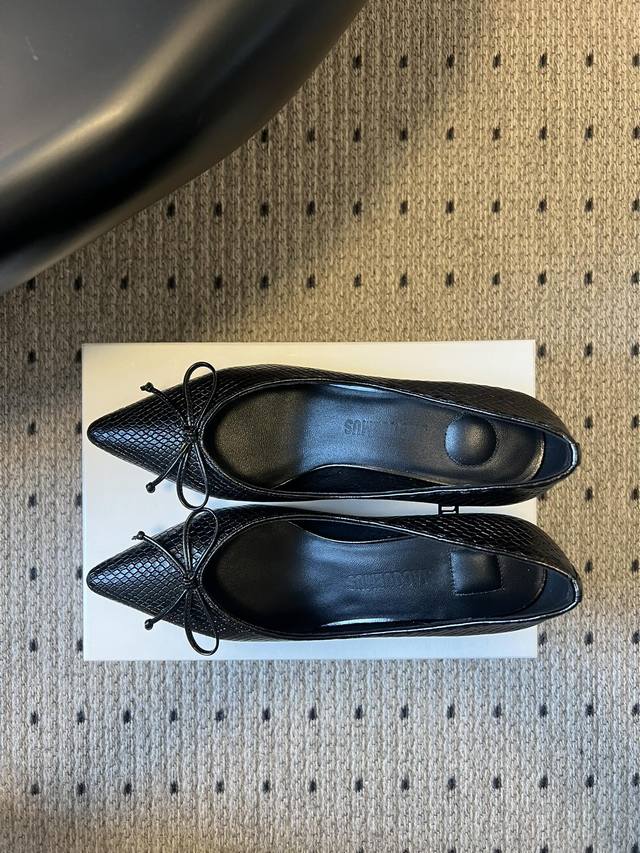 Jacquemu* 25Ss蝴蝶结低跟刀割纹尖头单鞋休闲鞋 DDD 尖头鞋型+鞋头细带蝴蝶结装饰,既拉长腿部线条,又自带温柔精致感;鞋身简约流畅,配色都是百搭的基础色系。鞋面是柔软真皮,触感细腻、贴合脚型,久穿不易磨脚; DDD 鞋跟是平跟设计,比高跟鞋更舒适,日常通勤、逛街都能驾驭。既能搭配裙装走温柔优雅路线,也能配裤装打造干练通勤风,是“日常利用率很高”的基础款。 DDD 鞋面:刀割牛皮 Ddd 内里:羊皮 Ddd 大底:意大利真皮大底 Ddd 跟高:3.5Cm Ddd Size:35-41 40、4