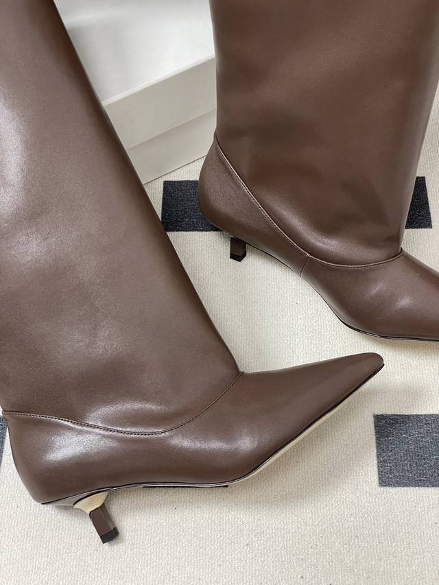 Jacquemus25Fw秋冬新款 尖头宽筒一脚蹬矮跟长靴小猫跟长筒靴子 DDD 黑色长靴界的“时髦尖子生” 利落尖头+小猫跟 大靴筒太鲨我 气场直接拉满 走哪都是焦点~ DDD 鞋面:牛皮 DDD 内里垫脚:羊皮 DDD 鞋底:意大利真皮大底 DDD 跟高:4.5Cm DDD 码数:35-39 40.41定做不退换 DDD