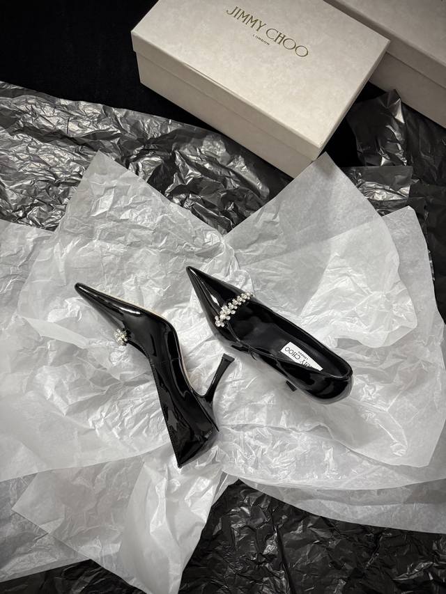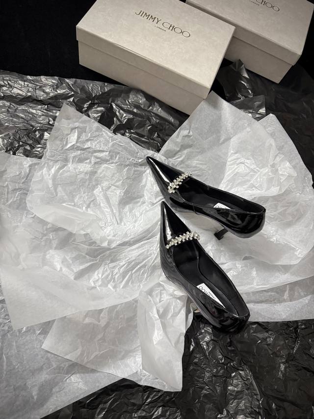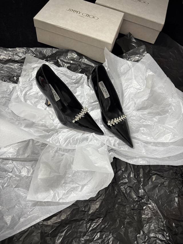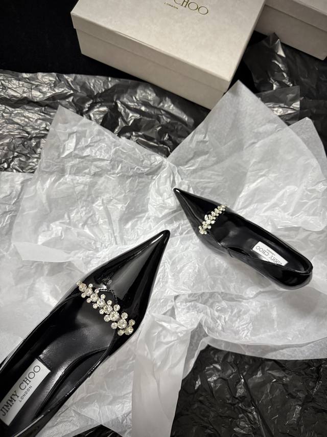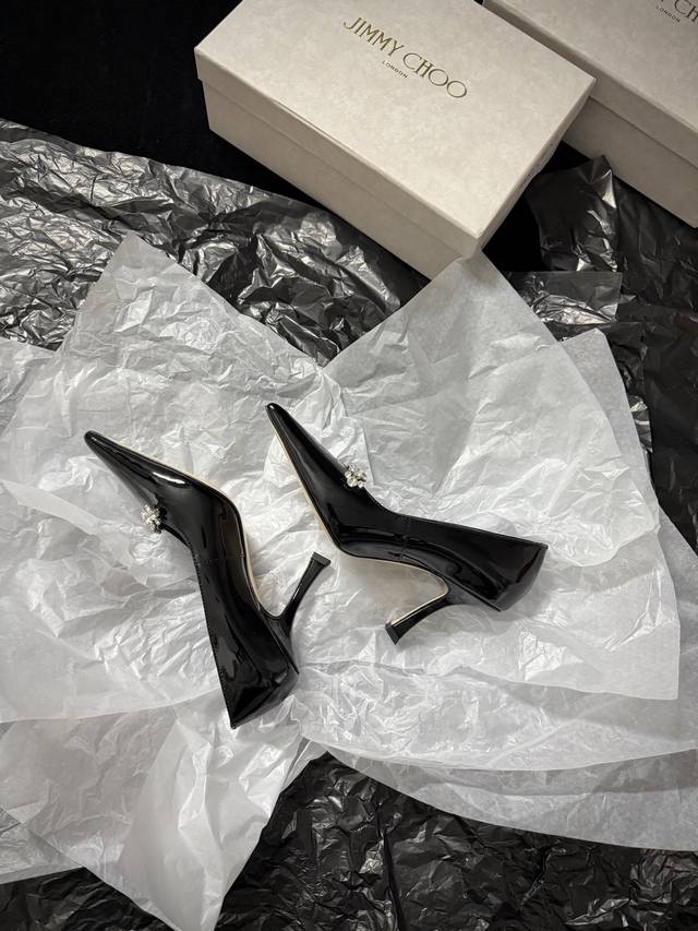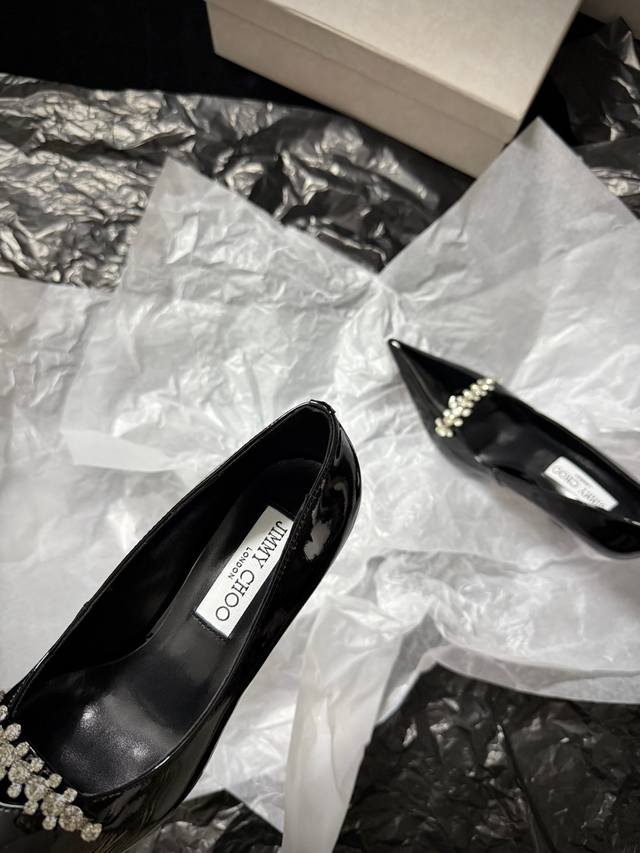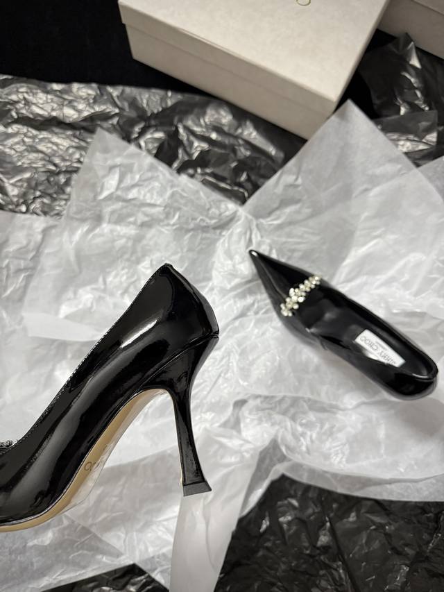 Jimmy Cho* 新品 尖头+水钻点缀 又酷又闪 上脚瞬间气场拉满 不管是晚宴还是出街 都能稳稳拿捏时髦感 谁穿谁是焦点~ 鞋面进口牛漆皮 内里进口羊皮 进口真皮大底 跟高:9Cm 35-39 40.41.42定