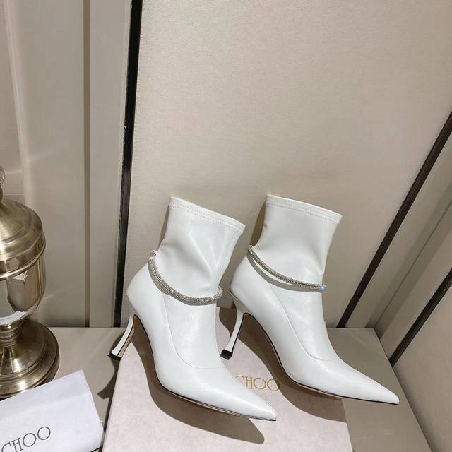 Jimmychoo 吉米.周仰杰高跟弹力短靴.原版开发.顶级品质.时尚性感.捷克钻装饰,靴子界的主流款鞋头细尖饱满、微微上翘做到了原版精髓定制纳帕弹力皮 软度做到柔软不塌一比一对格剪裁 接口部分缝合正确双线并齐车缝 严实细致鞋面:柔软弹力牛皮垫脚 内里:羊皮里大底:意大利进口真皮底码数:35-39定制34 40跟高:8Cm 工厂p价 DDD