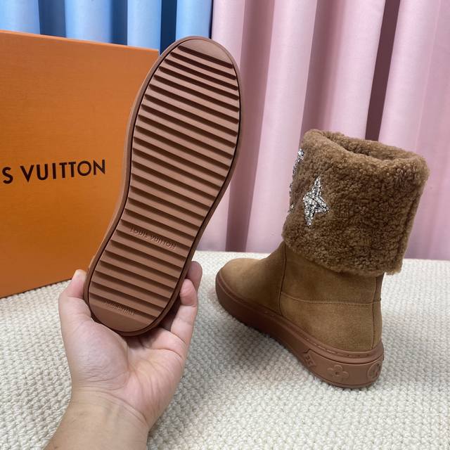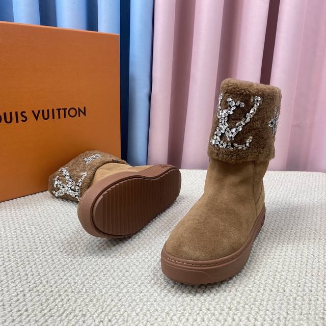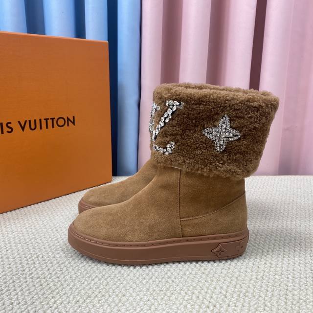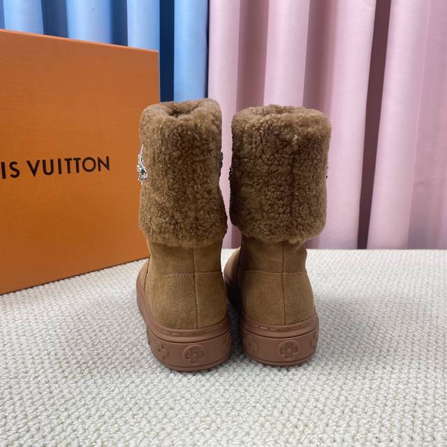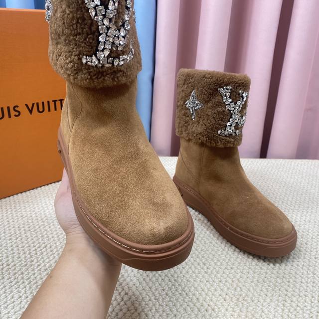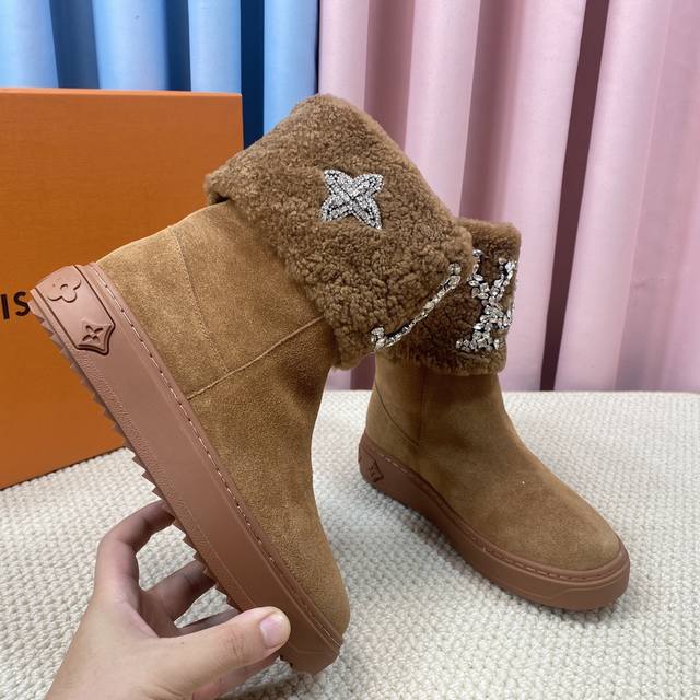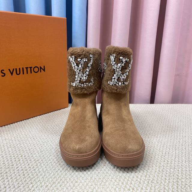 L V Fwnew Arrival~代购品质 L V 秋冬皮毛一体雪地短靴,进口皮毛一体羔羊毛,做大Logo原版奥钻装饰,超美 鞋面材质是比较厚实的丝光牛反绒,