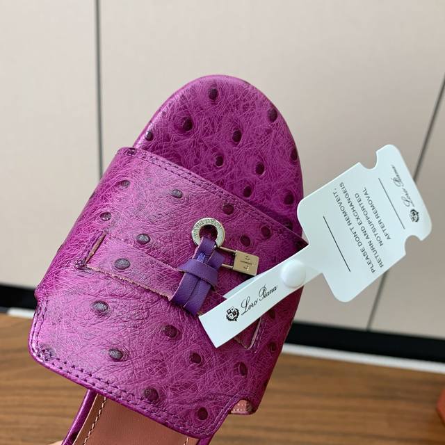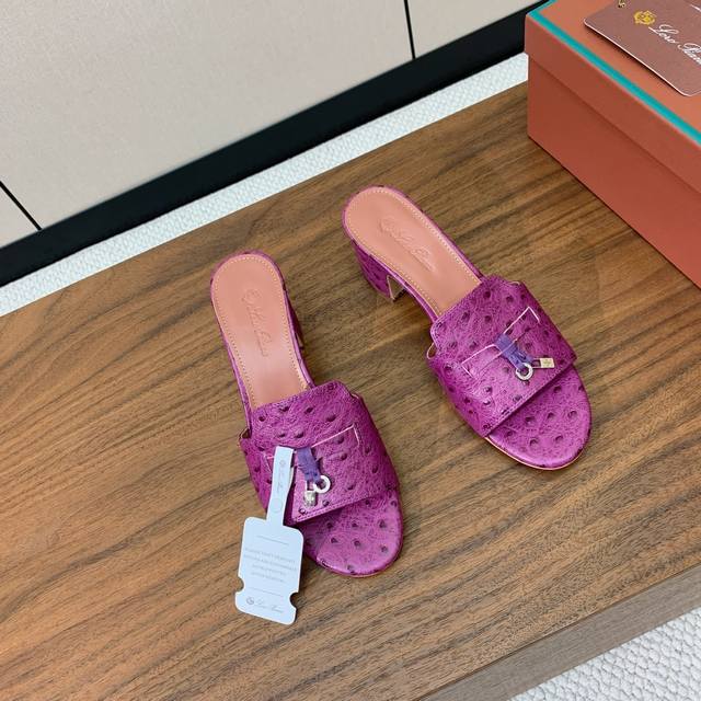 Loro Piana 驼鸟纹中跟拖鞋。鞋面驼鸟纹牛皮,羊皮内里及垫脚。真皮中底,真皮包跟。进口真皮大底。跟高8cm码数:34-42 34、40、41、42定制不