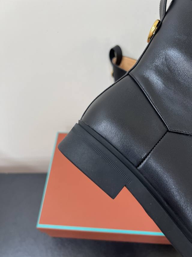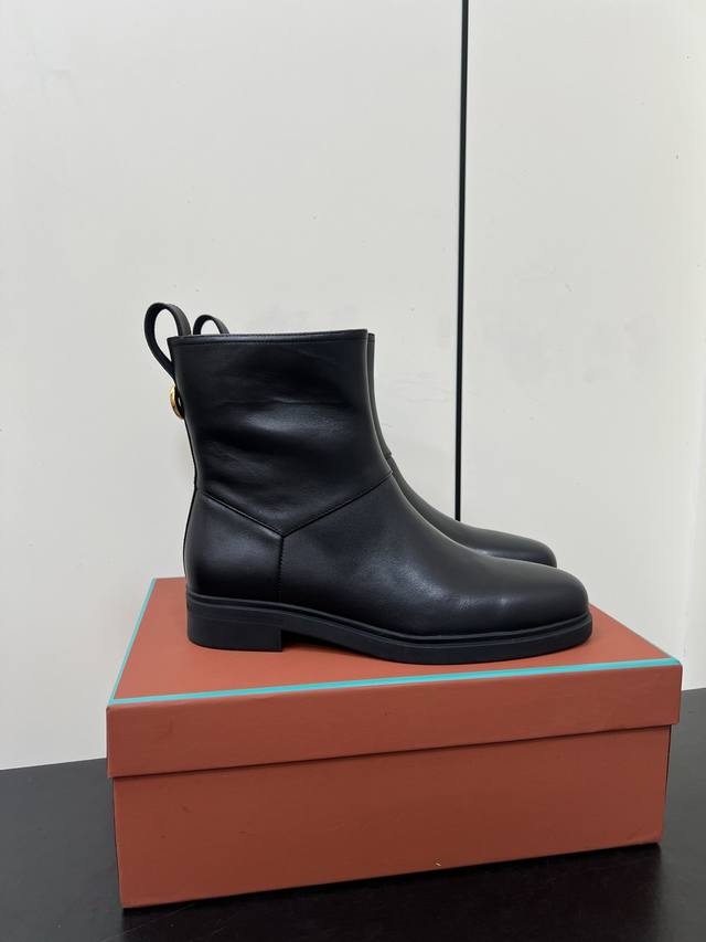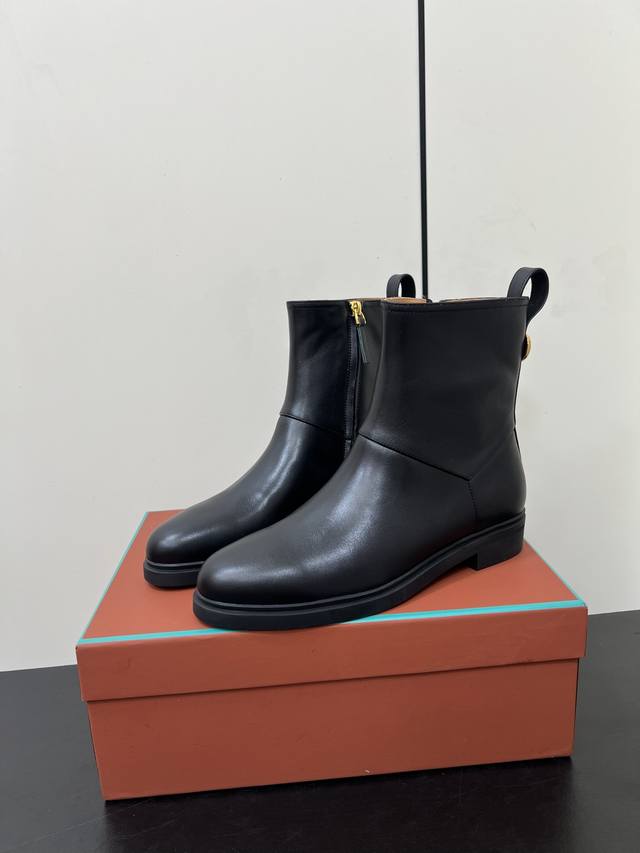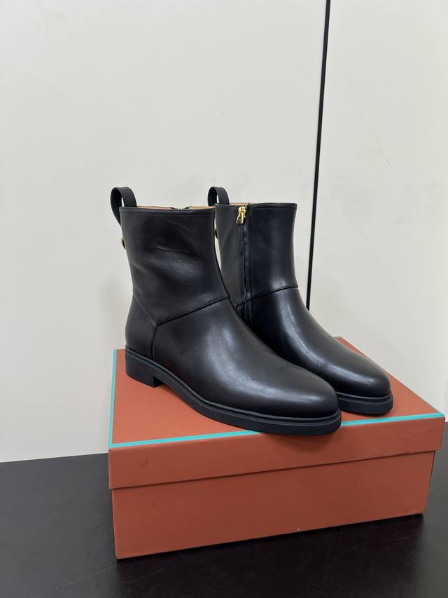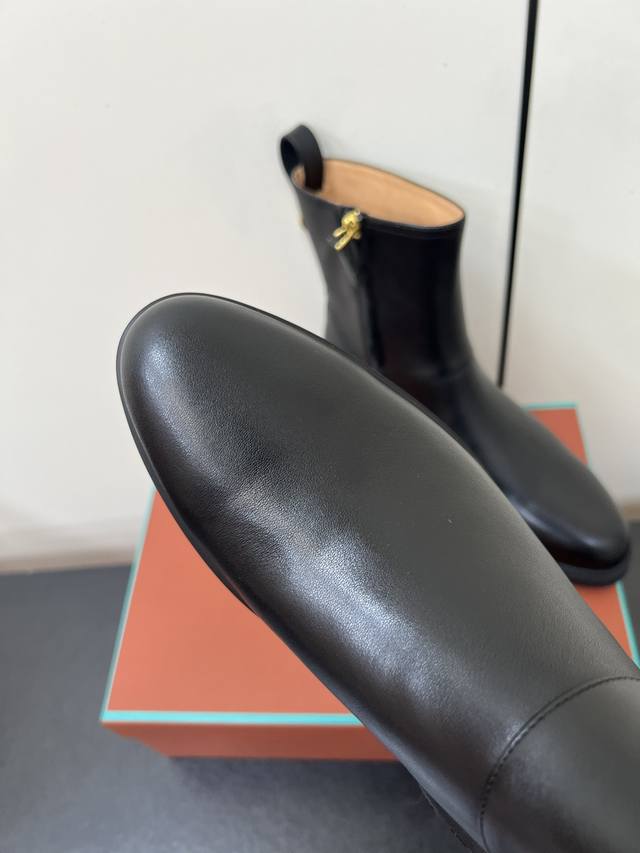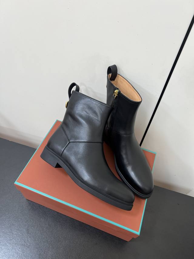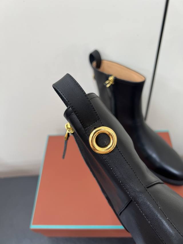 Loro Piana25S春夏新款 极简复古侧拉链平底短靴 非常极简复古的款式,鞋面整体就是哑光牛皮面的简单制作,只有纯粹的牛皮质感,唯有靴筒上多了圆环金色,侧面拉链更隐形也更方便穿脱!内里也是采用牛里制作,耐磨又好穿~整体靴筒比较短,所以整体重量超级轻便!橡胶大底更柔软好走哦~ 材质:头层牛皮 内里:牛里 大底:橡胶大底 鞋码:35-39 40 41定制不退换
