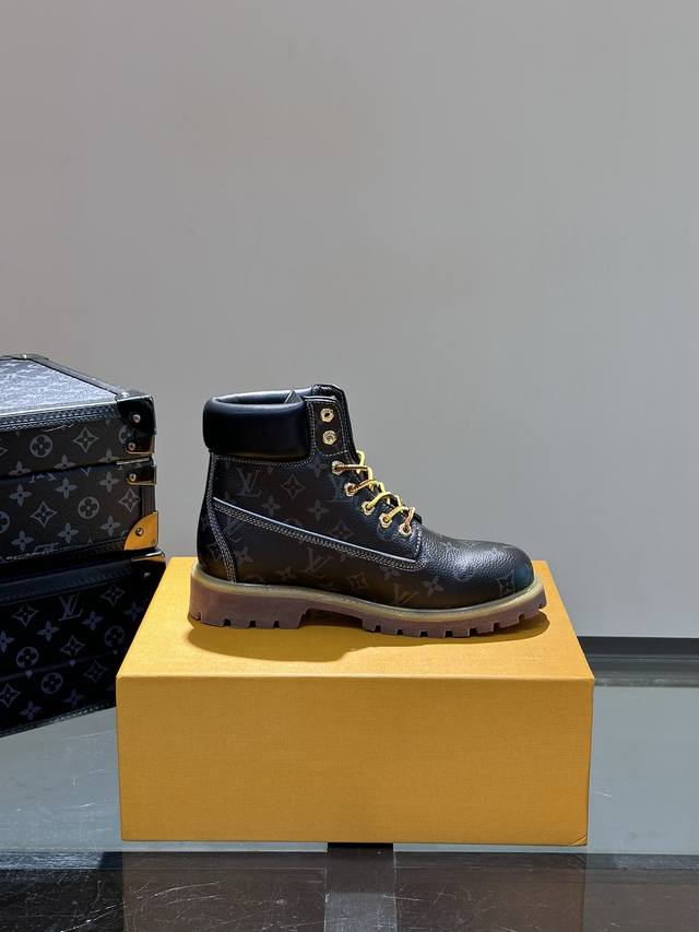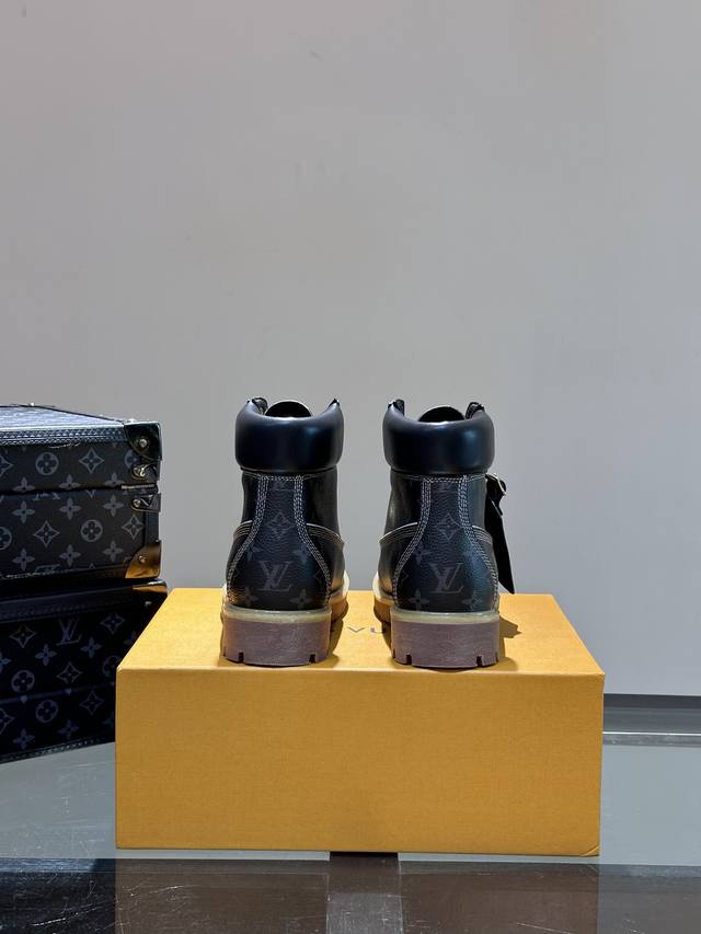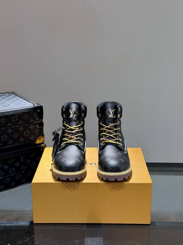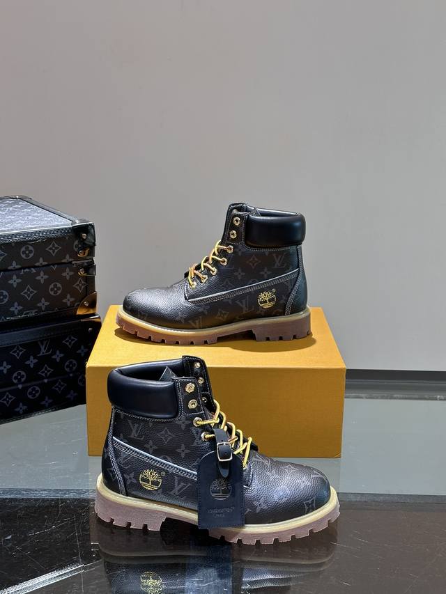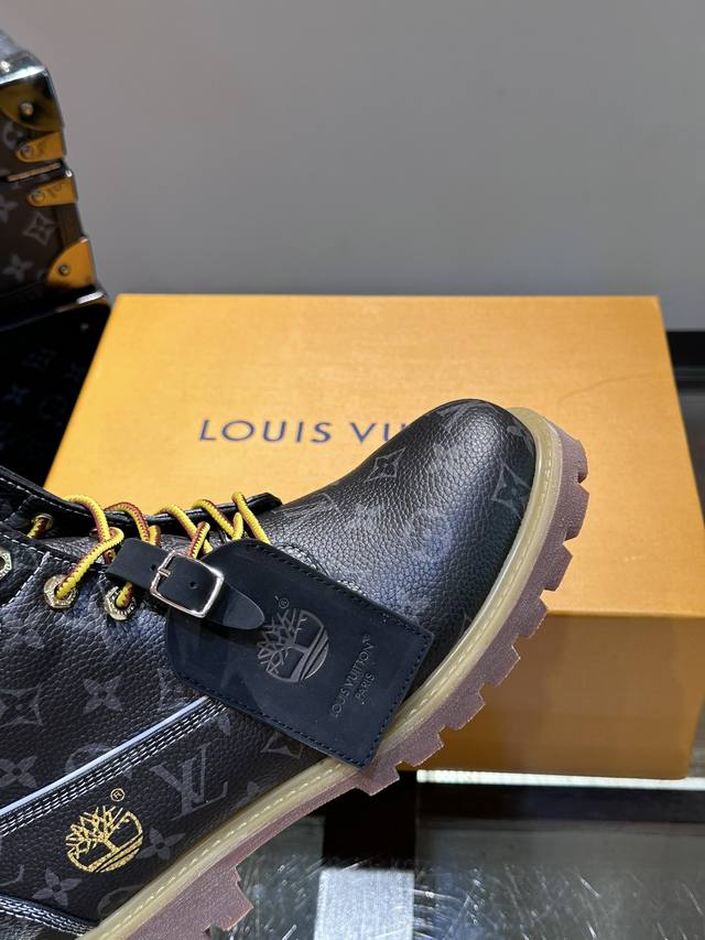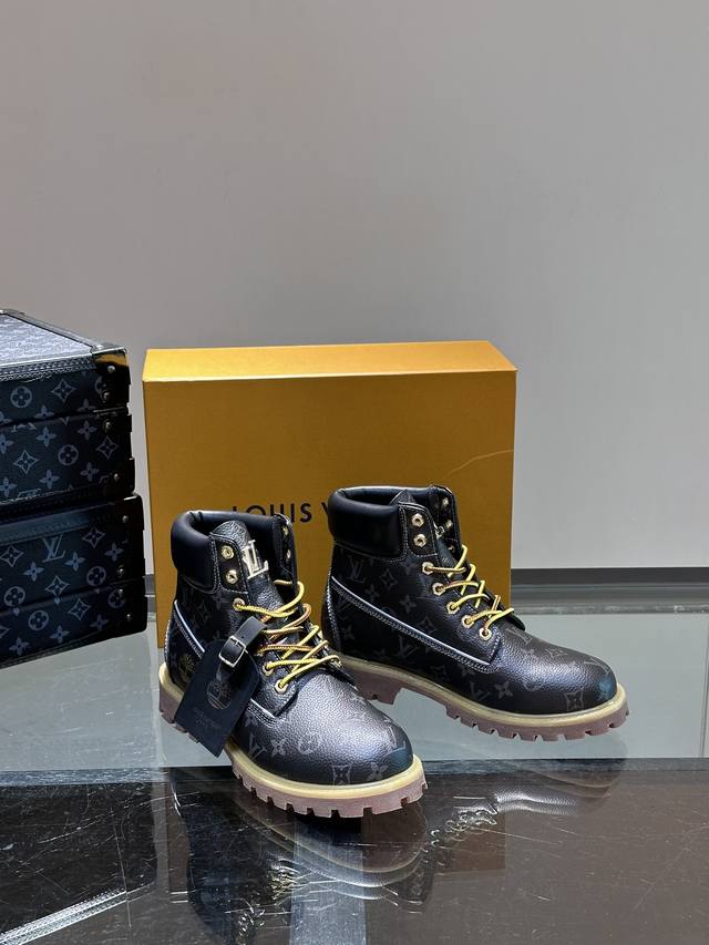 L*X Timberland 添柏岚 联名款 老花 大黄靴 及踝靴 短靴,L*X Timberland 及踝靴取材 Monogram 压纹防水正绒面牛皮革,依托品牌精湛匠艺于意大利悉心重塑经典 Timberland 6 英寸靴型,以美式工装格调瞩目亮相 pharrell Williams 打造的 秋冬男装秀。Monogram 压纹鞋舌、Timberland 原版鞋带和外底点睛考究细节,皮革标签抒写合作标识,配送专柜精美包装! Ddd psize:38-45 DDD