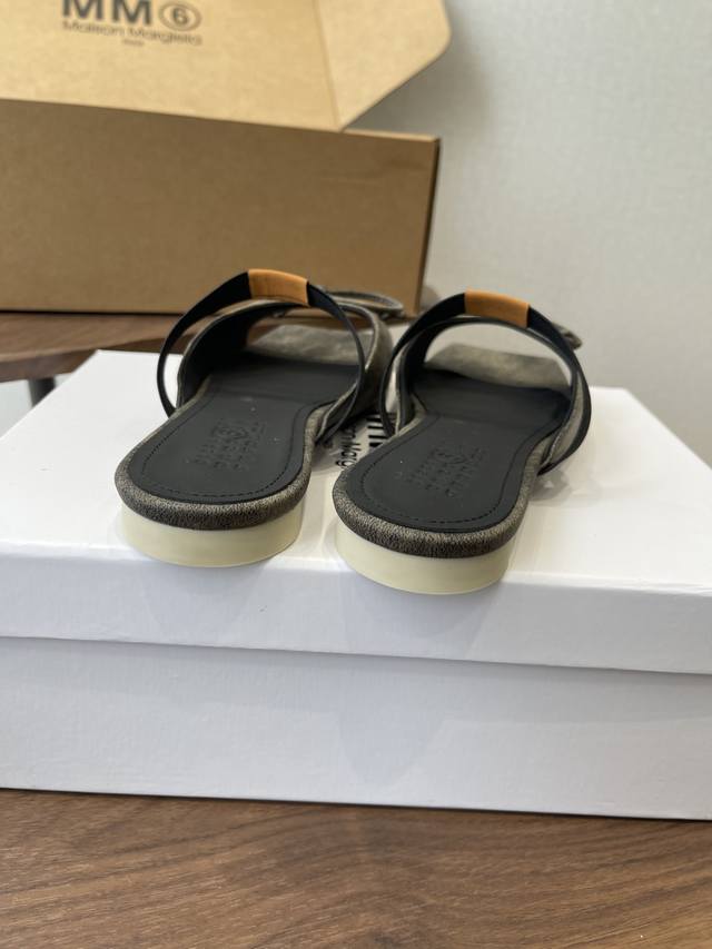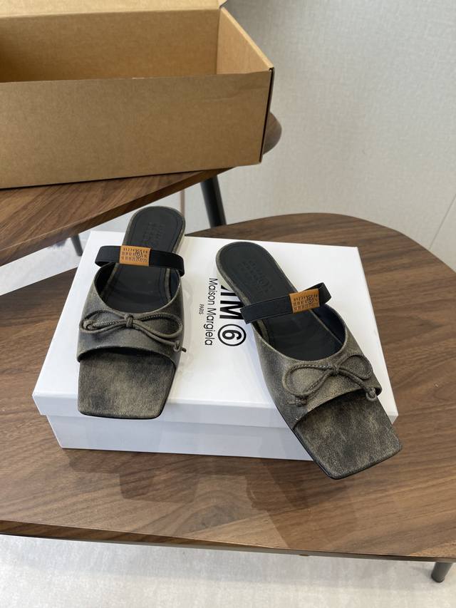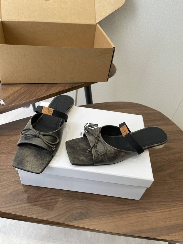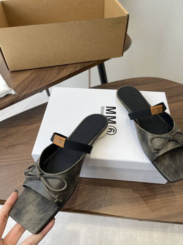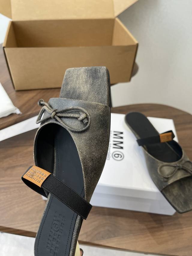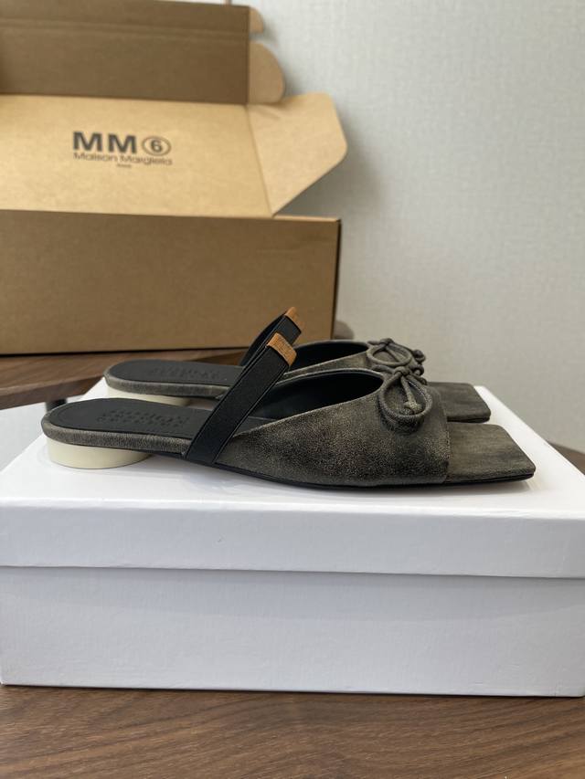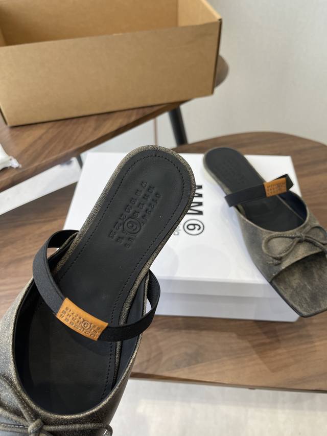 Maison Margiel方头弹力带芭蕾鞋平底鞋凉鞋 DDD 采用品牌标志性的贴合脚型的雕塑感轮廓,鞋面柔软且线条流畅,兼顾贴合度与设计感。方头+芭蕾元素融合:经典方头设计打造现代感,搭配鞋面蝴蝶结装饰,重构芭蕾鞋的优雅轮廓,同时做穆勒拖的后空款式,兼具休闲与精致。 DDD 鞋后跟处有标志性的白色单线缝线,鞋身弹性带带有Mm6数字标识,是品牌辨识度的关键。后空的穆勒拖结构,简化穿脱方式,将芭蕾鞋的柔美与穆勒鞋的随性结合。 DDD 鞋面:复古爆裂牛皮 Ddd 内里:丝绸羊皮里 Ddd 大底:真皮大底 Dd