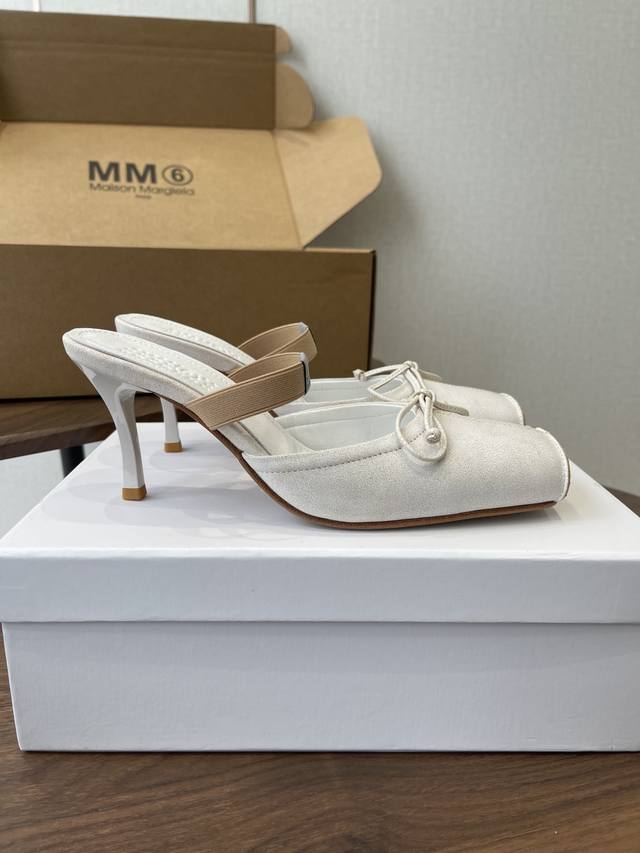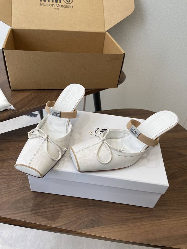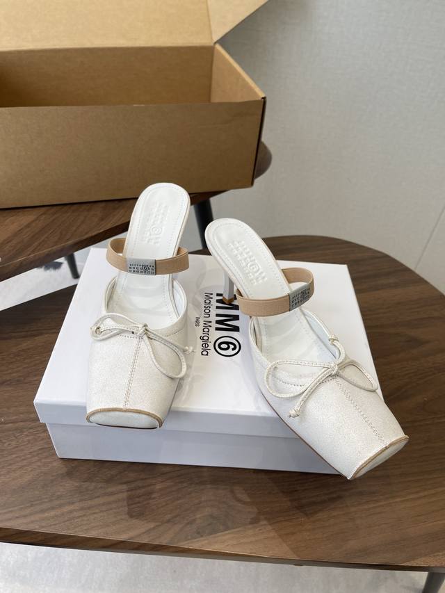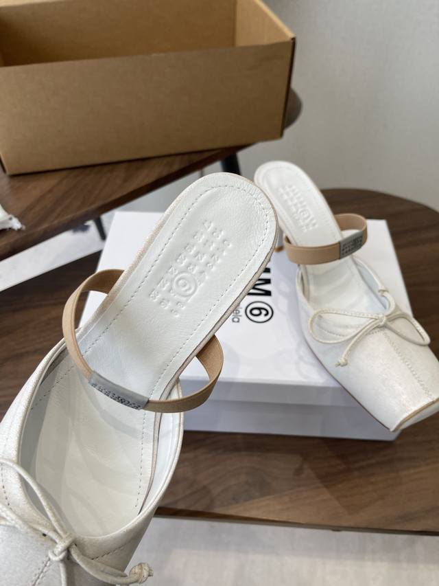 Maison Margiel方头弹力带芭蕾鞋平底鞋凉鞋 DDD 采用品牌标志性的贴合脚型的雕塑感轮廓,鞋面柔软且线条流畅,兼顾贴合度与设计感。方头+芭蕾元素融合:经典方头设计打造现代感,搭配鞋面蝴蝶结装饰,重构芭蕾鞋的优雅轮廓,同时做穆勒拖的后空款式,兼具休闲与精致。 DDD 鞋后跟处有标志性的白色单线缝线,鞋身弹性带带有Mm6数字标识,是品牌辨识度的关键。后空的穆勒拖结构,简化穿脱方式,将芭蕾鞋的柔美与穆勒鞋的随性结合。 DDD 鞋面:复古爆裂牛皮 Ddd 内里:丝绸羊皮里 Ddd 大底:真皮大底 Dd