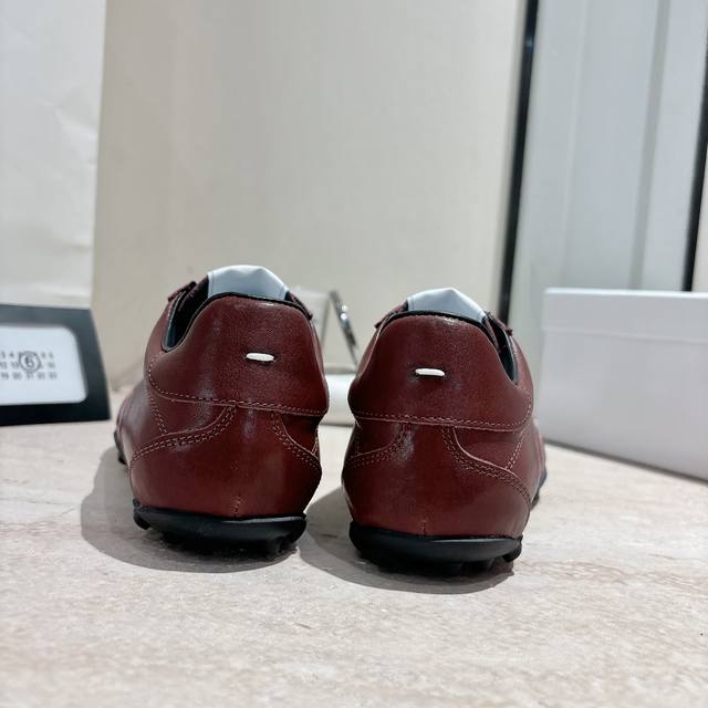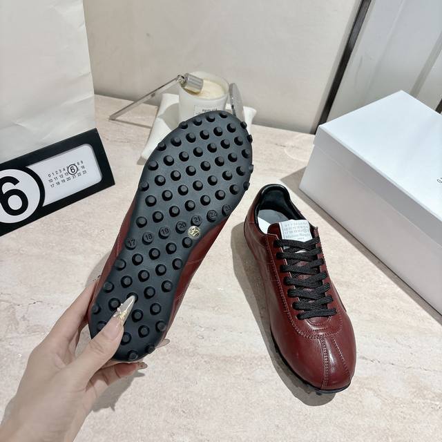 Maison Margiela 马吉拉2025秋冬系列情侣款阿甘鞋德训鞋 新款Sprinters运动鞋轮廓采用做旧植柔牛皮制成,灵感来源于复古跑鞋。通过做旧、缝线、拼接等工艺,赋予单品新的生命和美感。舌头饰有经典的数字标志,搭配有防滑的钉状鞋底,鞋尾饰有标志性的白色缝线Logo,充满工艺感。 面料:牛皮 原版橡胶大底 码数:35-39 40-44 女40男45定做 配原版一致包装