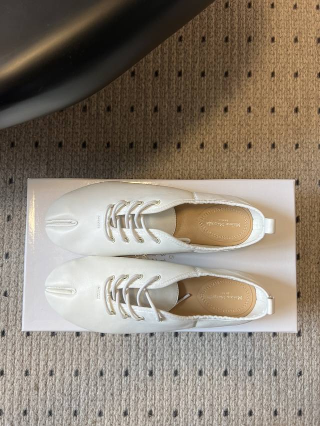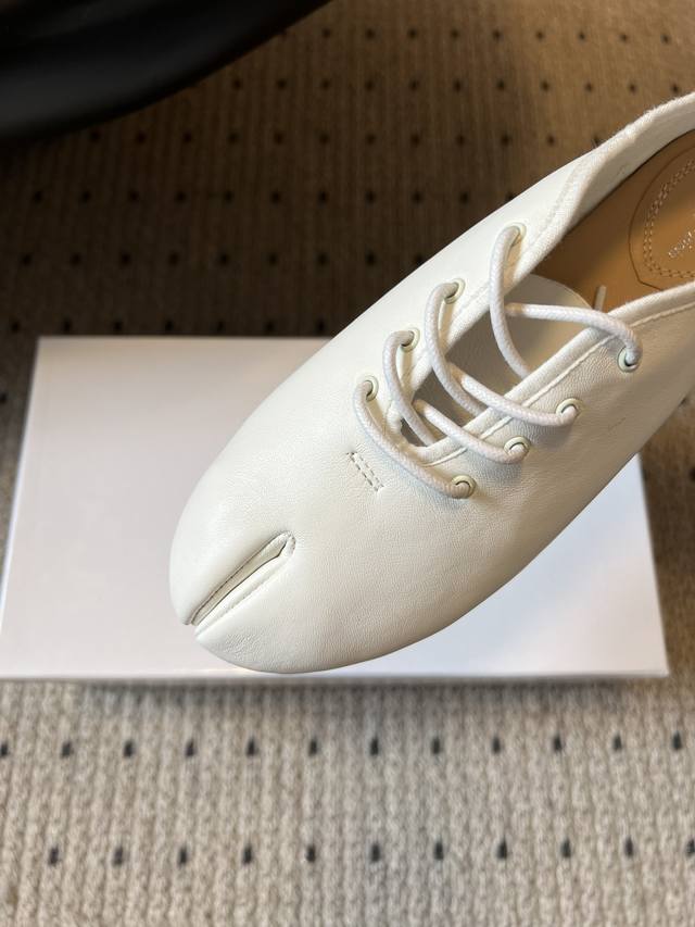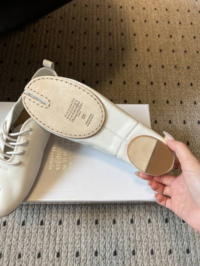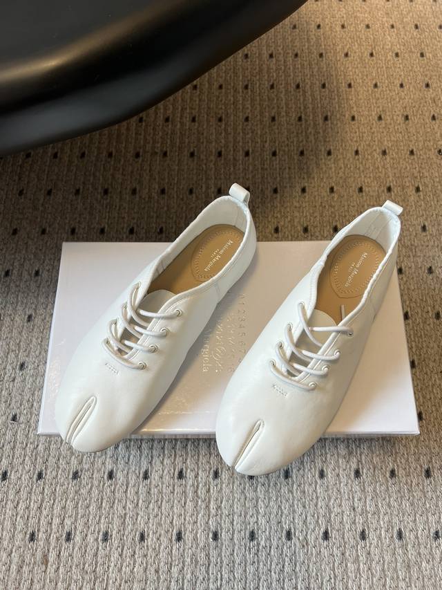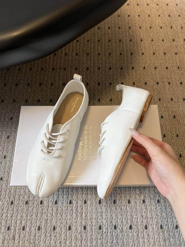 Maison Margiela 马吉拉Mm6系带Tabi分趾鞋 DDD 鞋头是标志性分趾造型,搭配系带款式,自带先锋小众的辨识度,风格独特不撞款。鞋面是细腻皮革,部分款式有金属光泽或纹理质感,细节处显高级;鞋内有品牌标识,调性统一。 DDD 兼具极简与先锋感,能搭极简风西装、复古牛仔裤、小众设计感连衣裙,适配先锋、慵懒、轻熟等多种风格。平底鞋型,脚感舒适;鞋型贴合脚型,日常通勤或休闲场合都能穿。 DDD 鞋面:牛皮 羊皮 DDD 内里:双面绒 DDD 大底:真皮大底 DDD 增高:2Cm DDD Size