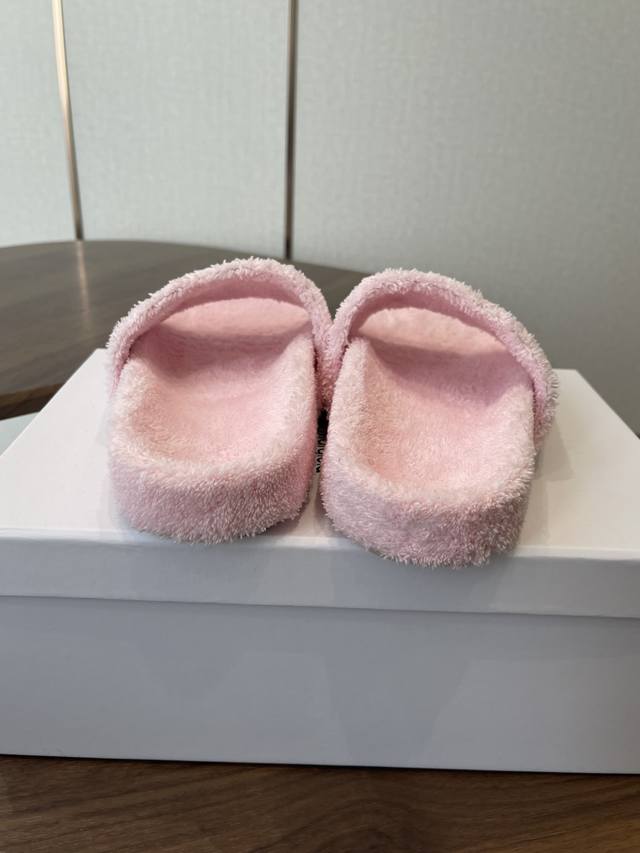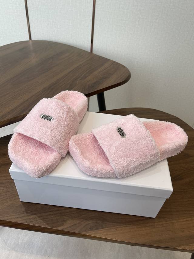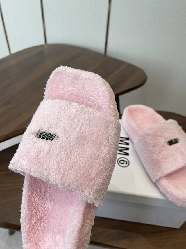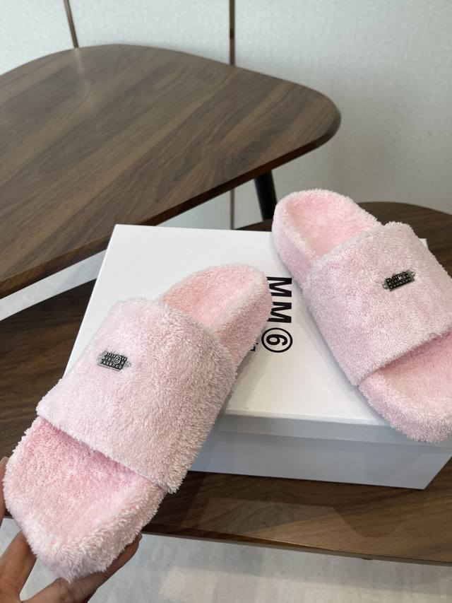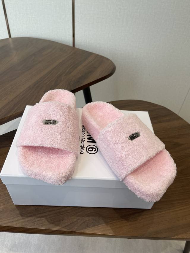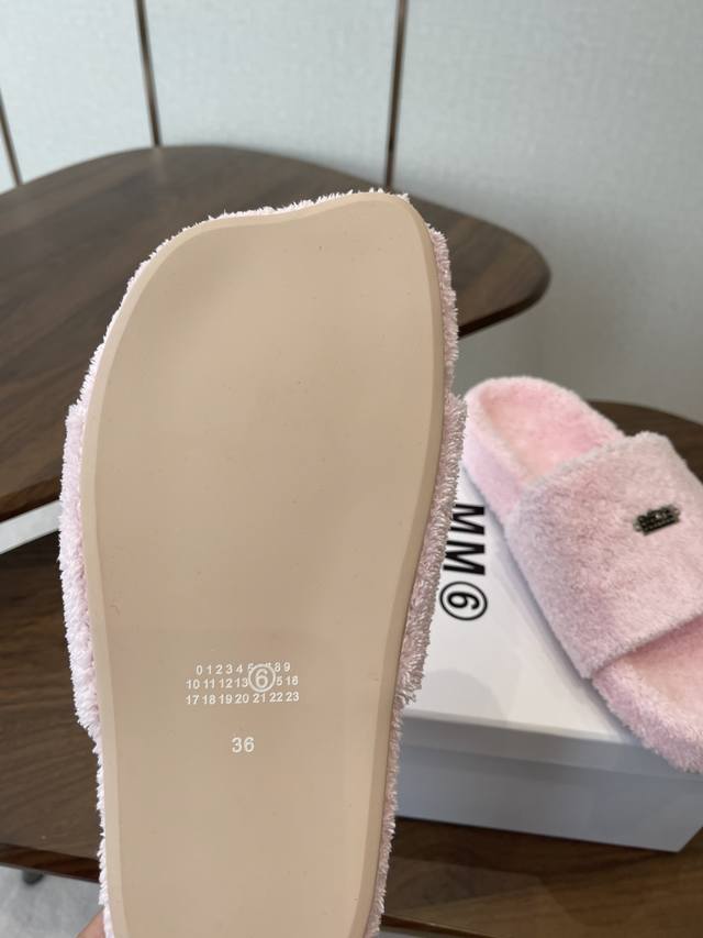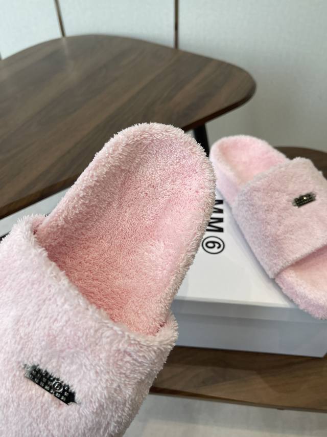 FFF Maison Margiela26Ss厚底平头毛绒拖鞋 DDD 绒面柔软蓬松,亲肤性强,脚感如同踩在云朵上;鞋底为橡胶材质,防滑耐磨,兼顾居家与外出的实用性。内里与鞋垫同材质包裹,无硬边磨脚问题,冬季穿着保暖性优异。鞋身带有马吉拉标志性的数字标签,低调又具品牌辨识度;经典一字带拖鞋版型,简约利落。 DDD 配色丰富,涵盖黑色、米白、焦糖棕、粉色、明黄等,既有基础百搭款,也有亮眼的糖果色选择,适配不同穿搭风格。版型为平底宽松款,不挤脚且适配多种脚型,居家、通勤、逛街等场景均可穿着。 DDD 鞋面:羊