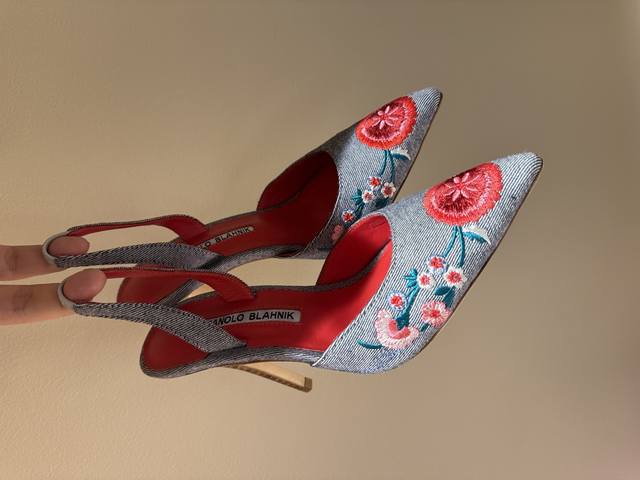 Manolo Blahnik经典花朵刺绣手工缝制中古高跟凉鞋,25新款水洗牛仔绝美高跟凉鞋