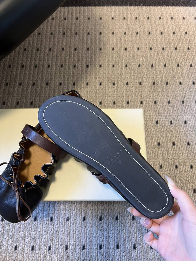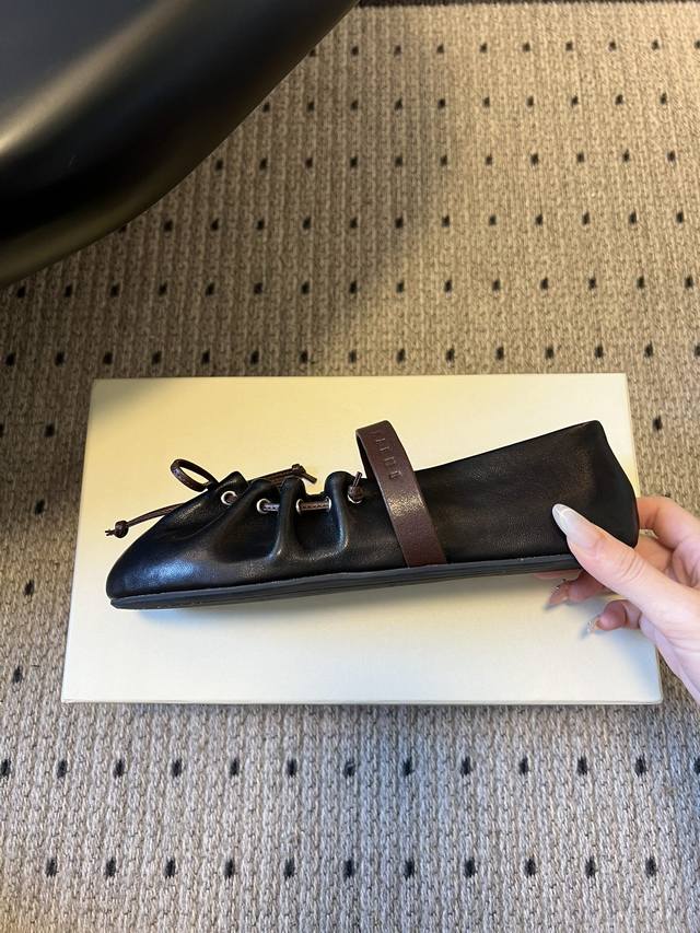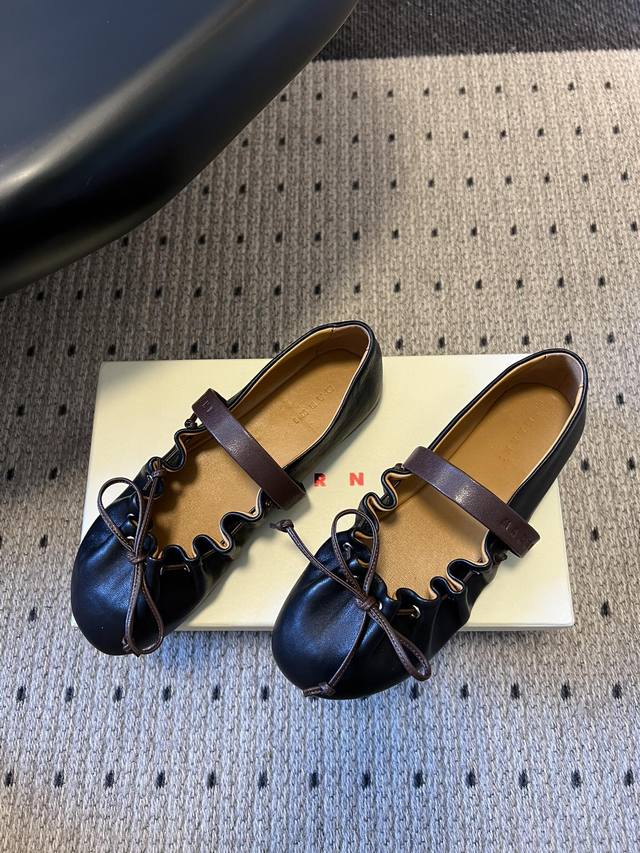 Marn*褶皱荷叶边玛丽珍芭蕾鞋平底鞋 DDD 融合芭蕾平底鞋的柔软鞋型与玛丽珍鞋的细绑带,鞋口加入荷叶边褶皱装饰,鞋头搭配细带蝴蝶结,甜美元素中又因皮革的质感增添了复古酷感,打破了芭蕾鞋的单一优雅感。 DDD 鞋面采用软质皮革,鞋身有弹性褶皱设计,能贴合脚型且不压脚;平底无跟的版型搭配微宽的鞋楦,兼顾日常行走的舒适度与包容性。童趣的荷叶边、蝴蝶结与简约的芭蕾鞋型结合,打造出辨识度高的“甜妹风+复古风”结合的鞋款。 DDD 鞋面:羊皮 Ddd 内里:羊皮 Ddd 大底:橡胶发泡 Ddd 增高:2Cm Dd