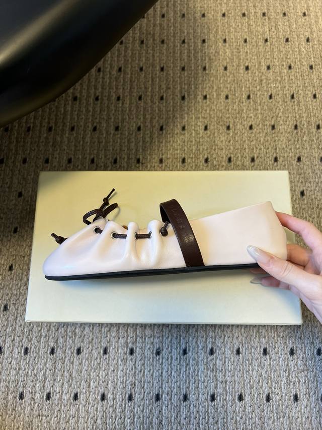 Marn*褶皱荷叶边玛丽珍芭蕾鞋平底鞋 DDD 融合芭蕾平底鞋的柔软鞋型与玛丽珍鞋的细绑带,鞋口加入荷叶边褶皱装饰,鞋头搭配细带蝴蝶结,甜美元素中又因皮革的质感增添了复古酷感,打破了芭蕾鞋的单一优雅感。 DDD 鞋面采用软质皮革,鞋身有弹性褶皱设计,能贴合脚型且不压脚;平底无跟的版型搭配微宽的鞋楦,兼顾日常行走的舒适度与包容性。童趣的荷叶边、蝴蝶结与简约的芭蕾鞋型结合,打造出辨识度高的“甜妹风+复古风”结合的鞋款。 DDD 鞋面:羊皮 Ddd 内里:羊皮 Ddd 大底:橡胶发泡 Ddd 增高:2Cm Dd