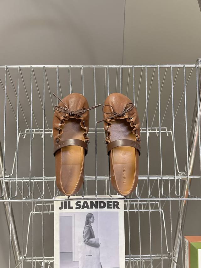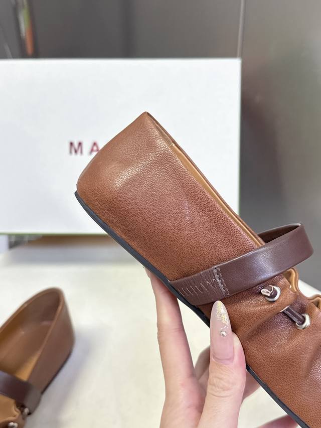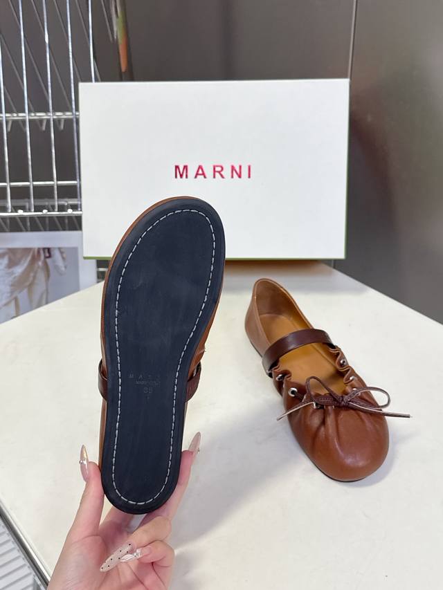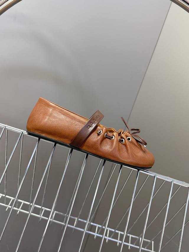 Marni玛尼2026春夏褶皱蝴蝶结 玛丽珍 芭蕾舞鞋 DDD 超多明星网红种草 简约的设计 圆头轮廓、撞色鞋面、棕色蝴蝶结与鞋口绑带,整体呈现可爱、极简的调性