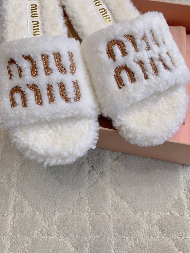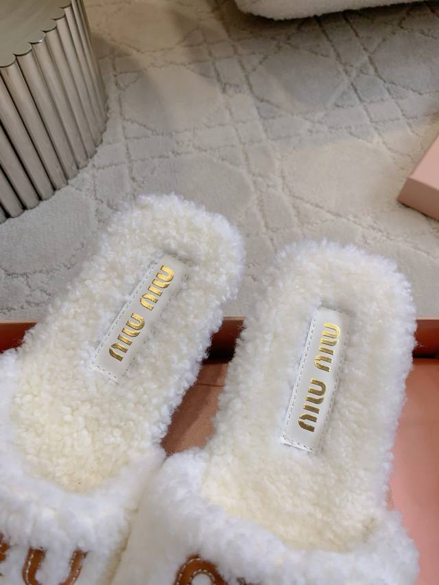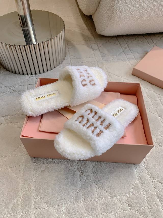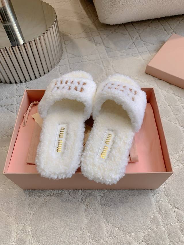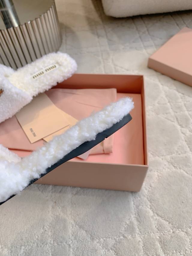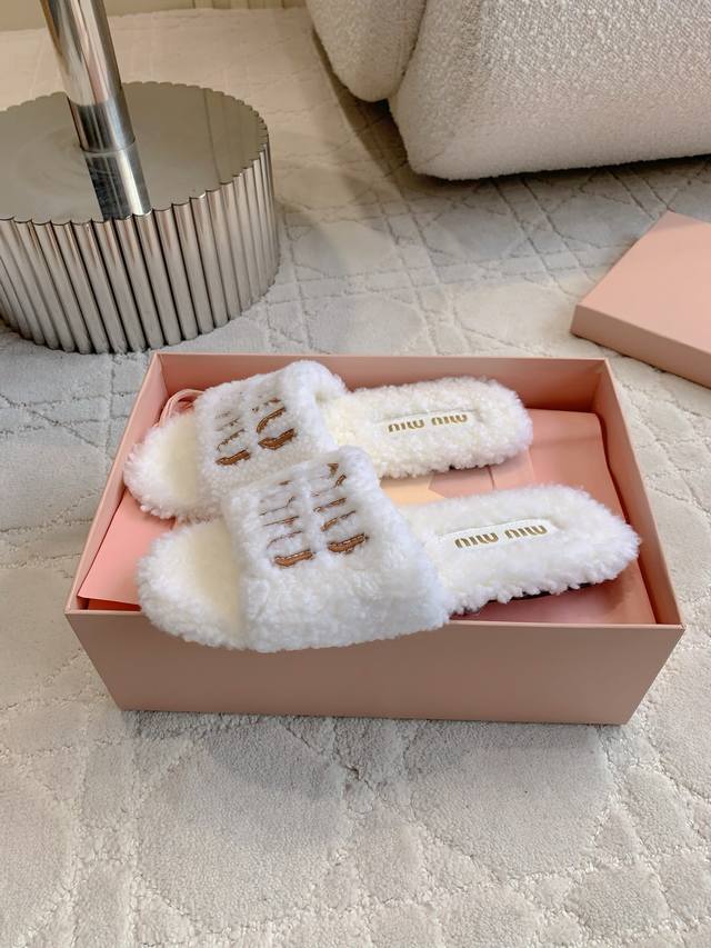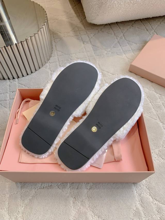 Miu 新款毛毛拖鞋 经典Miu刺绣Logo好看又百搭 超级厚实的澳洲进口羊毛 犹如踩在云朵般的感觉 超级舒适 经典百搭款 面料进口澳洲羊毛 原版开模大底 尺码